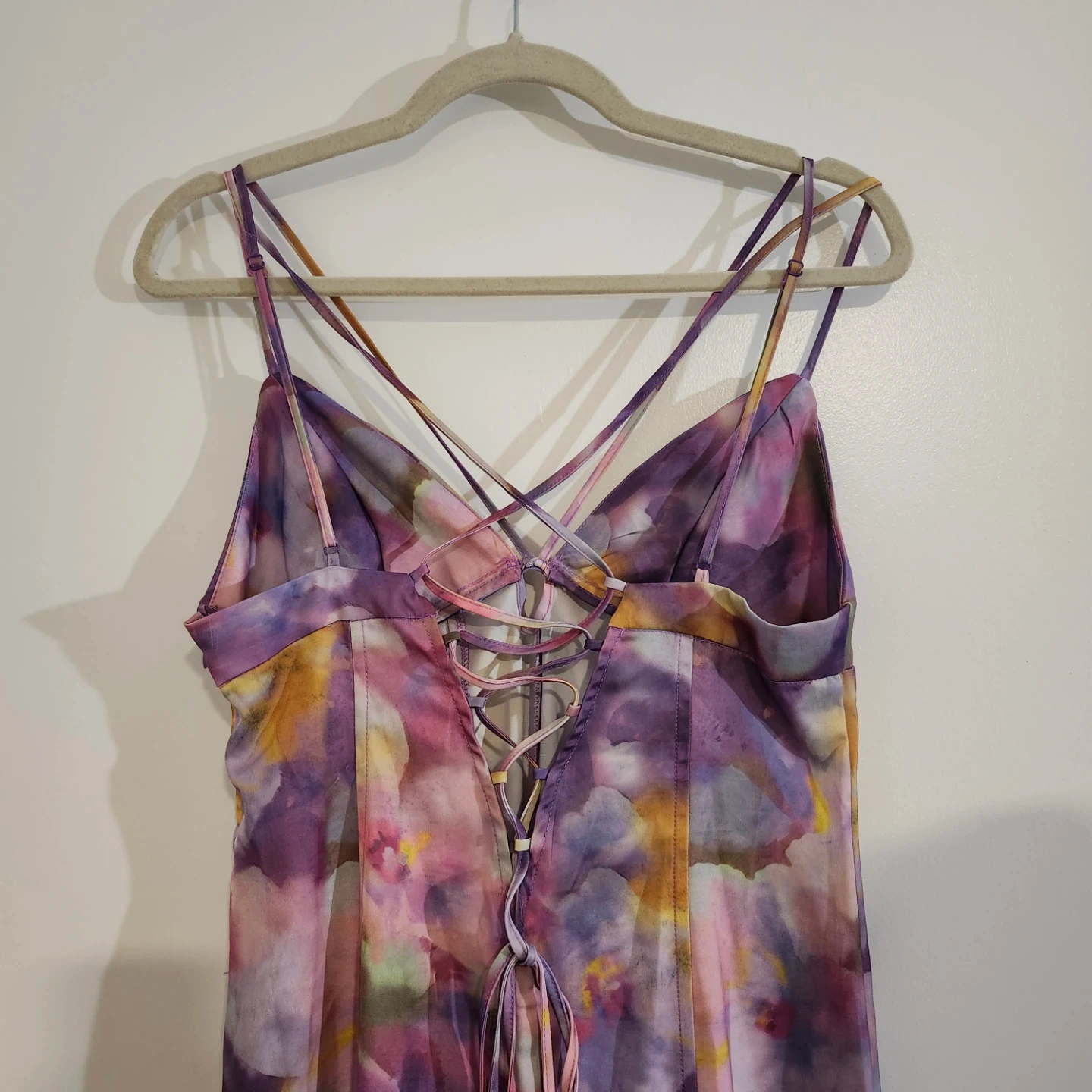 Here's a lovely dress with a unique floral pattern in shades of purple, yellow, and white! It features a stylish strappy design and a flattering silhouette. The dress is perfect for adding a pop of colour to your wardrobe and is sure to turn heads.