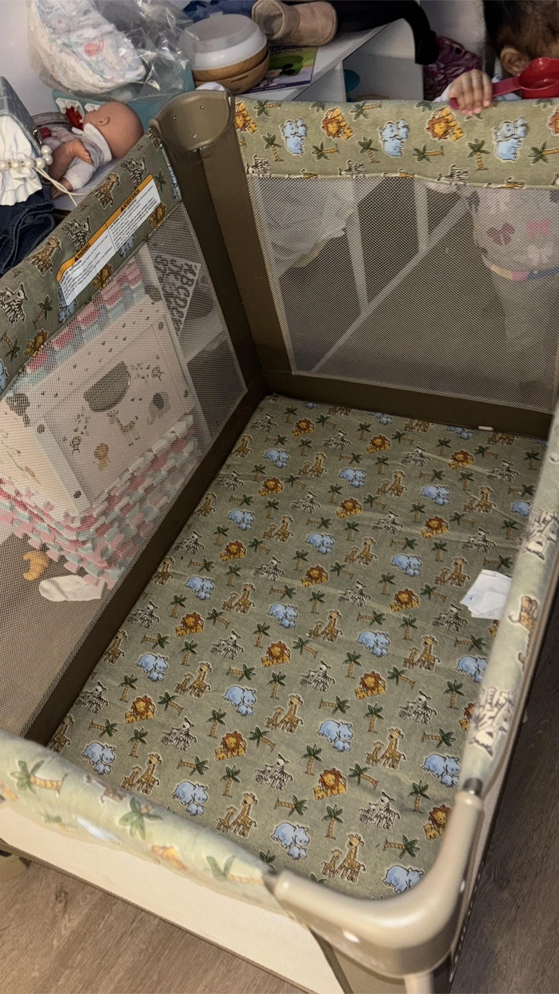 Pack 'n Play with a safari print! It's in good condition and ready for a new little one. Perfect for travel or keeping at grandma's house
