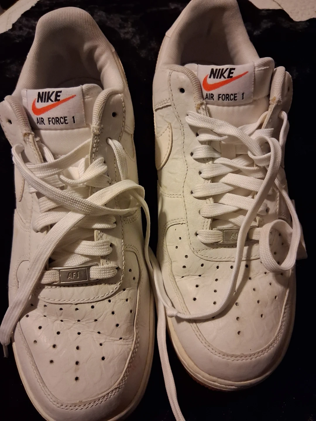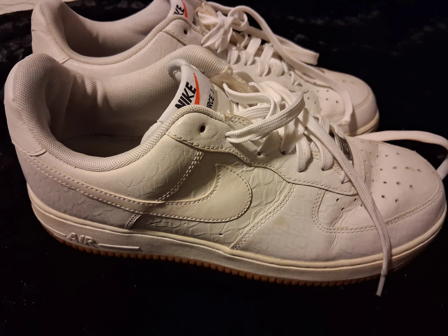 Selling a pair of Nike Air Force 1s in white, size US 9. They show some signs of wear, but still have lots of life left!