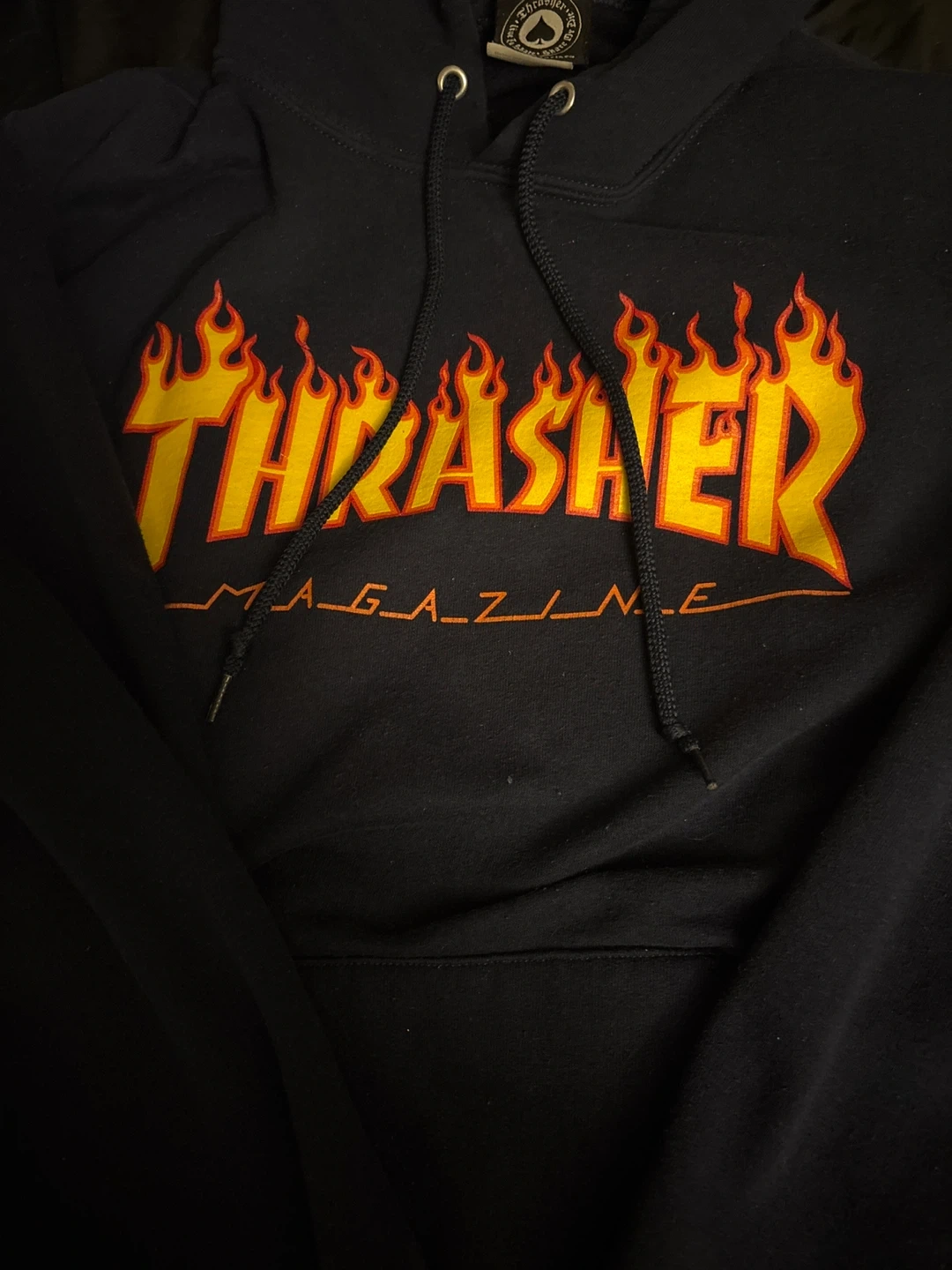 Selling a Thrasher hoodie with the iconic flame logo! It's a black hoodie with the Thrasher logo in yellow and orange flames. Great for skaters or anyone who likes the style!