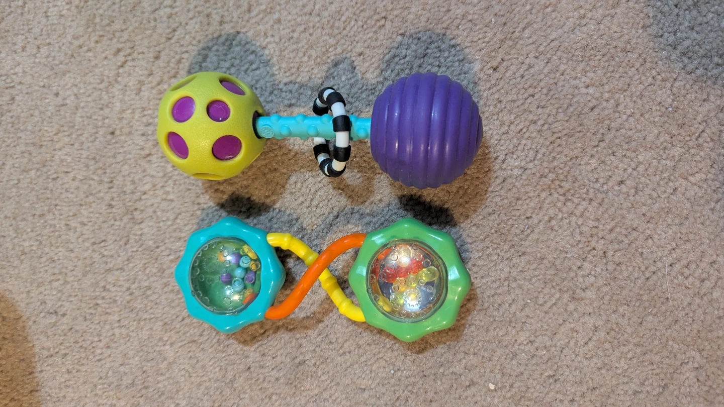 Here's a fun and colourful Infantino rattle for your little one! It features balls, beads, and bells to stimulate your baby's senses. The rattle is in great condition and ready for a new home! $7 for both