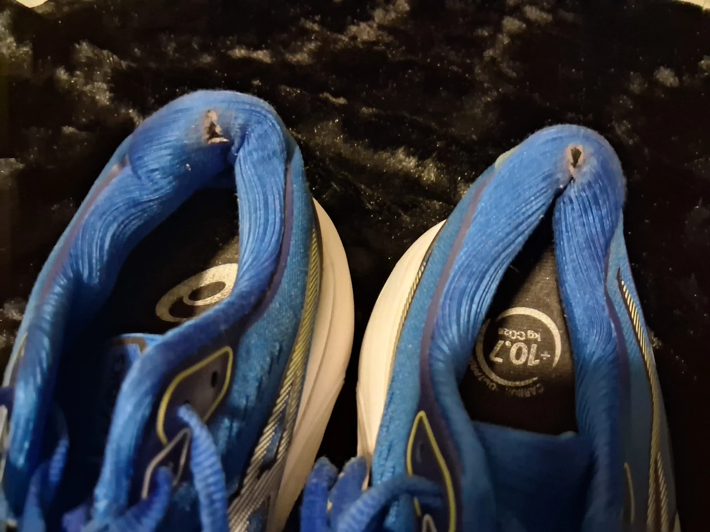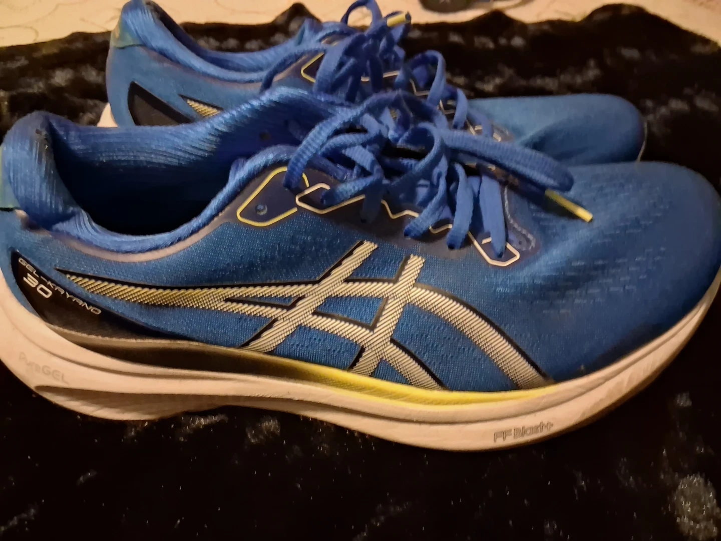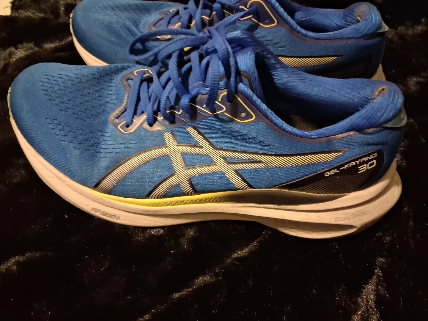 Selling a pair of Asics Gel-Kayano 30 running shoes in blue. They show some signs of wear, as you can see in the pictures, but they're still ready for some runs!