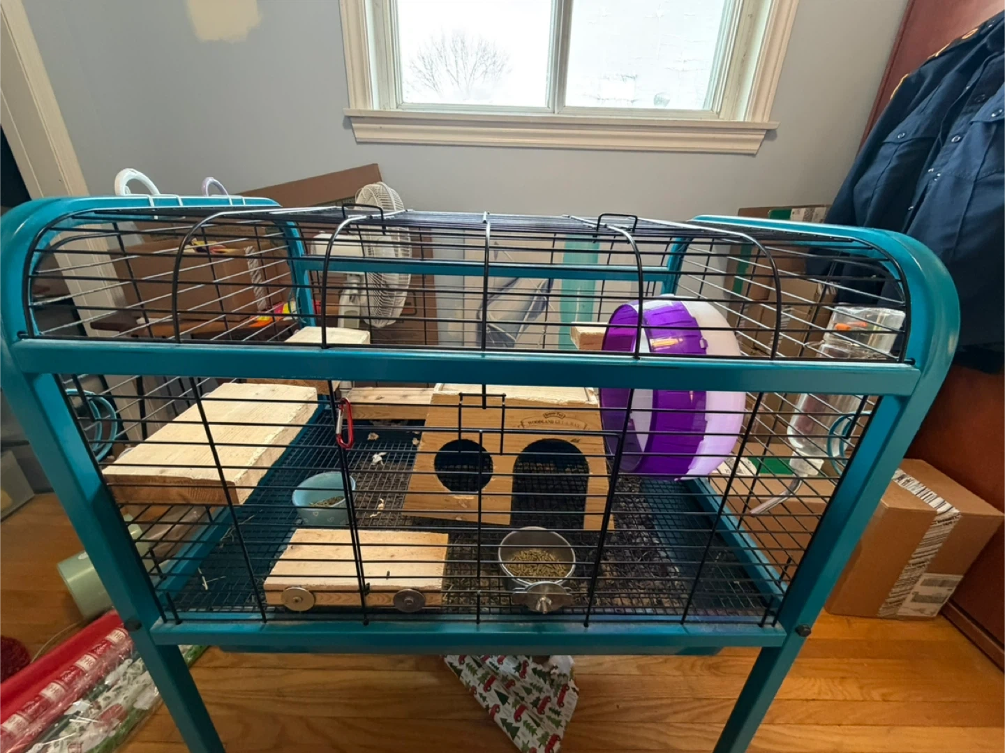 Greater starter kit! Includes everything in the picture. Cage, hiding house, dish, water bottle, ledges, wheel. In great condition. I only used it as a transitional cage while introducing a third chinchilla to my existing pair.