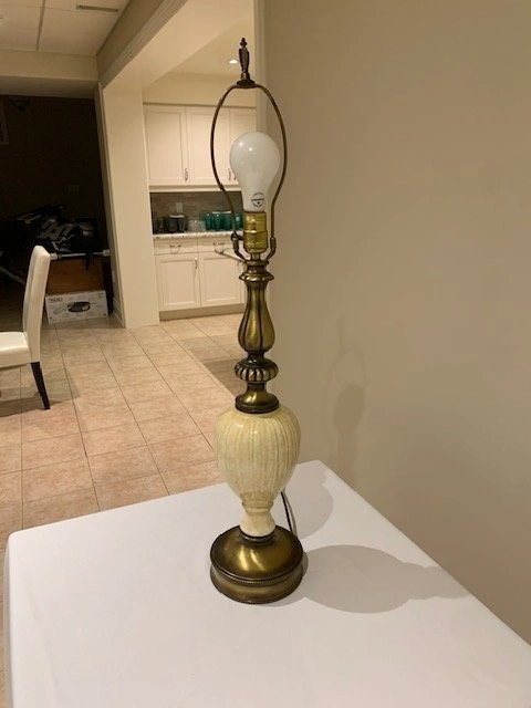 Beautiful Hollywood Regency Brass Lamp with Glazed Porcelain Centre In A Soft Butter Cream