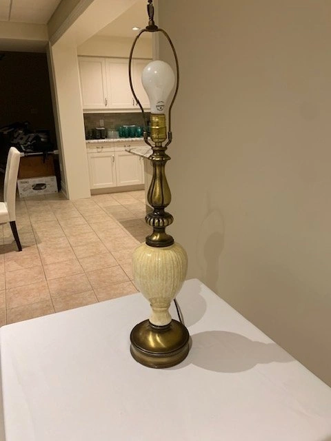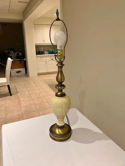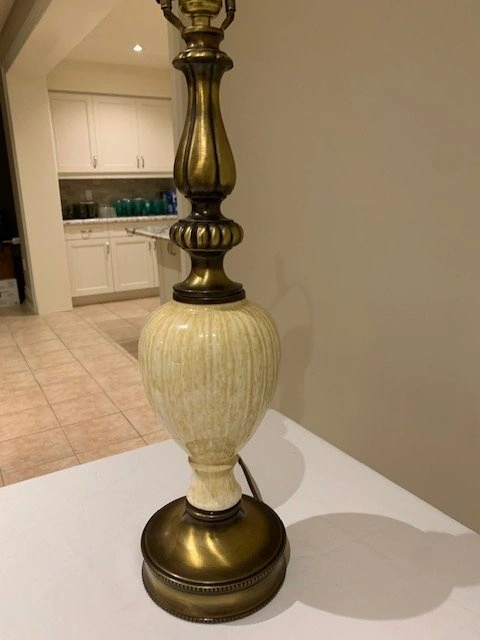 Beautiful Hollywood Regency Brass Lamp with Glazed Porcelain Centre In A Soft Butter Cream
