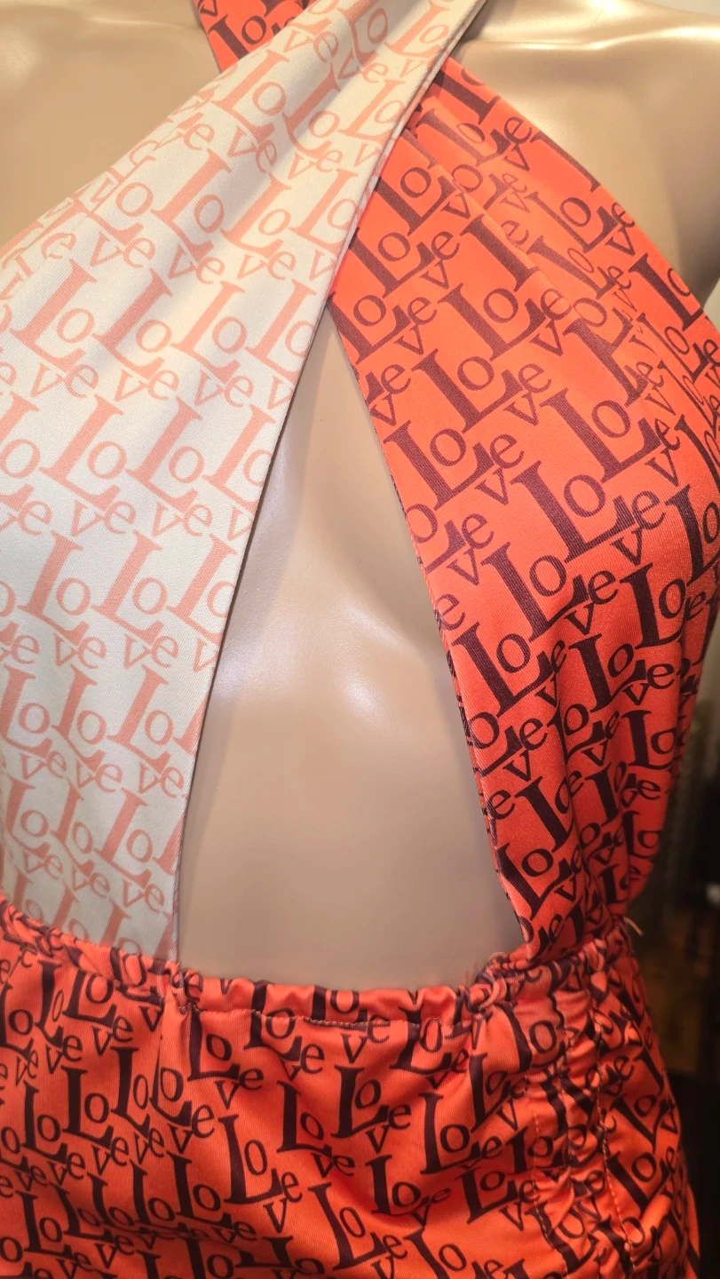 This halter mini dress features an eye-catching orange and white LOVE print. It has a stylish halter neckline and a ruched skirt with a side slit. Perfect for Valentines day or a special occasion!