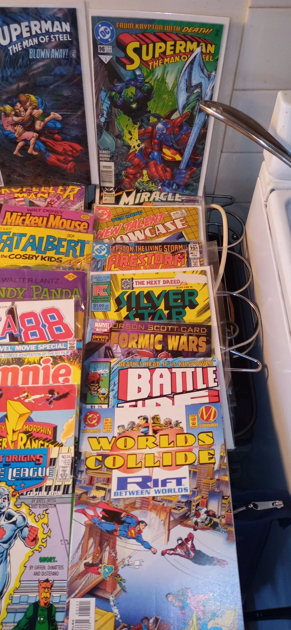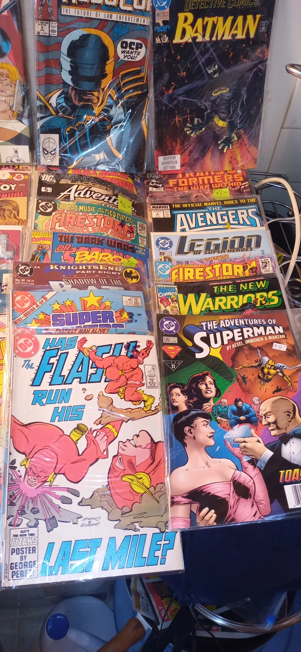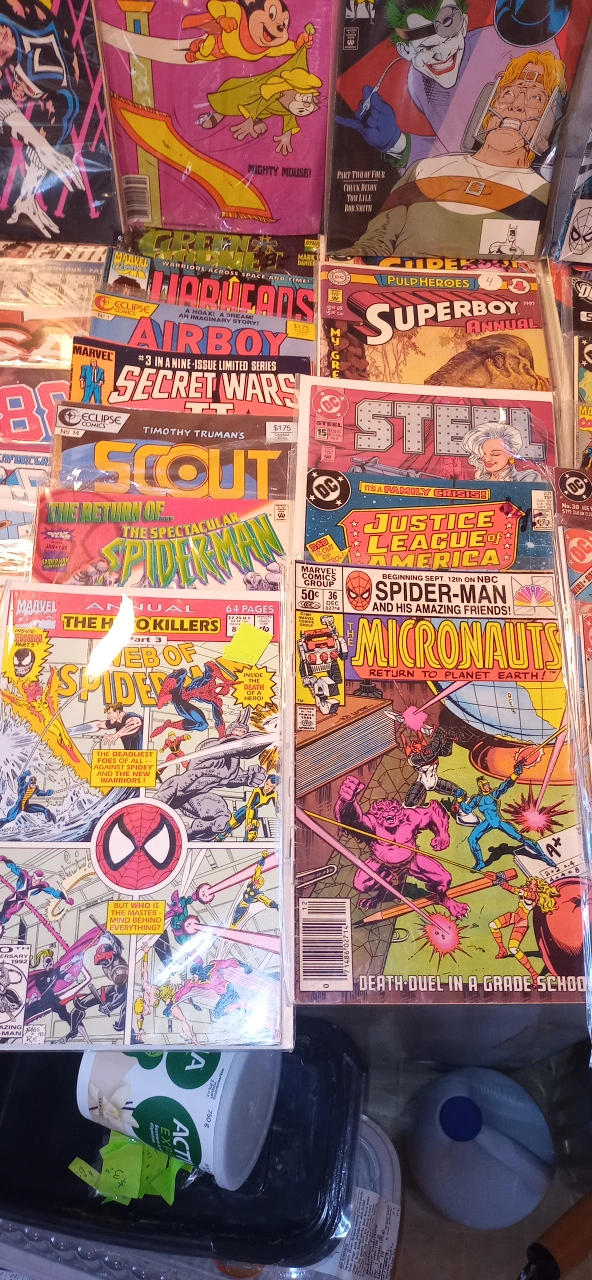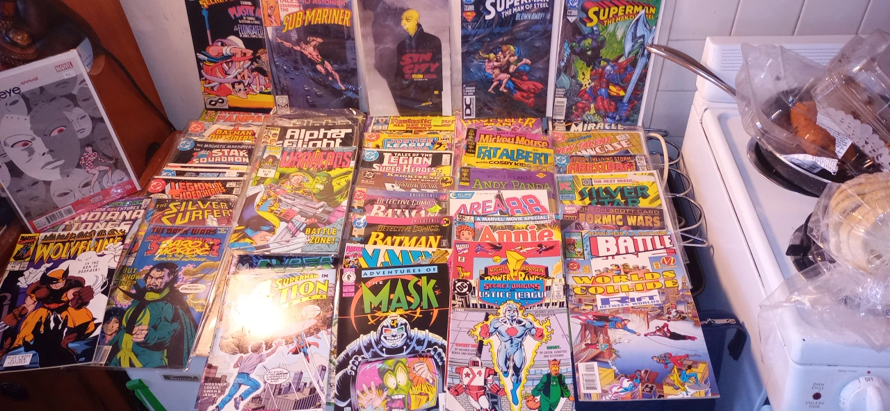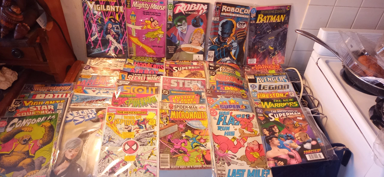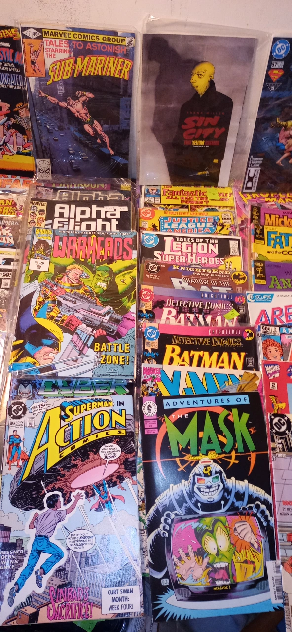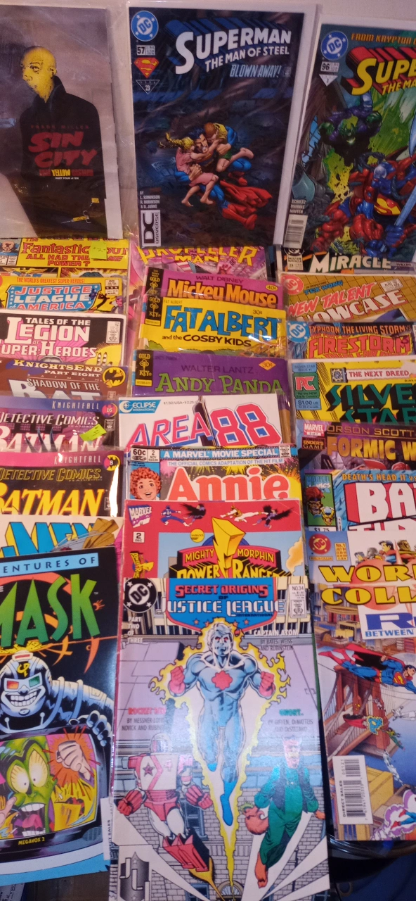 There is around 100 vintage comics in excellent condition. Most of them are worth $5 to $20 each. Everything from Batman,Superman, Justice League, Robin, Sub Mariner,Indiana Jones, Alpha Flight, Formic Wars, Siverstar, Firestorm, Green Lantern,Mister Miracle, Area 88, Andy Panda, Fat Albert,Mickey Mouse, The Legion of Superheros, Justice League of America, Fantastic Four, Dr, Strange, Silver Surfer, The secret six,Steel, X Factor, and many many more!!!. All Vintage.The whole box is worth over $1000+. I'm asking $250. takes all. 97%are in bags. Somme singles for a fact are worth $50+ easy. This is a great investment. They only go up in price with time. Must pick up. This will go fast....Happy New Year! Jim.