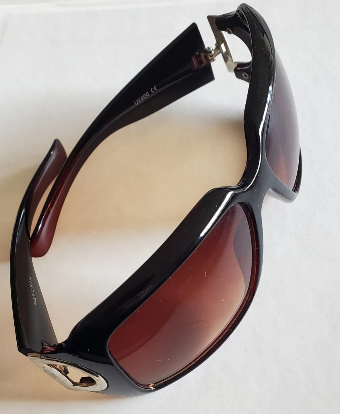 Selling a pair of sunglasses with UV400 protection. They have a stylish black frame and brown lenses. There are some signs of wear.
