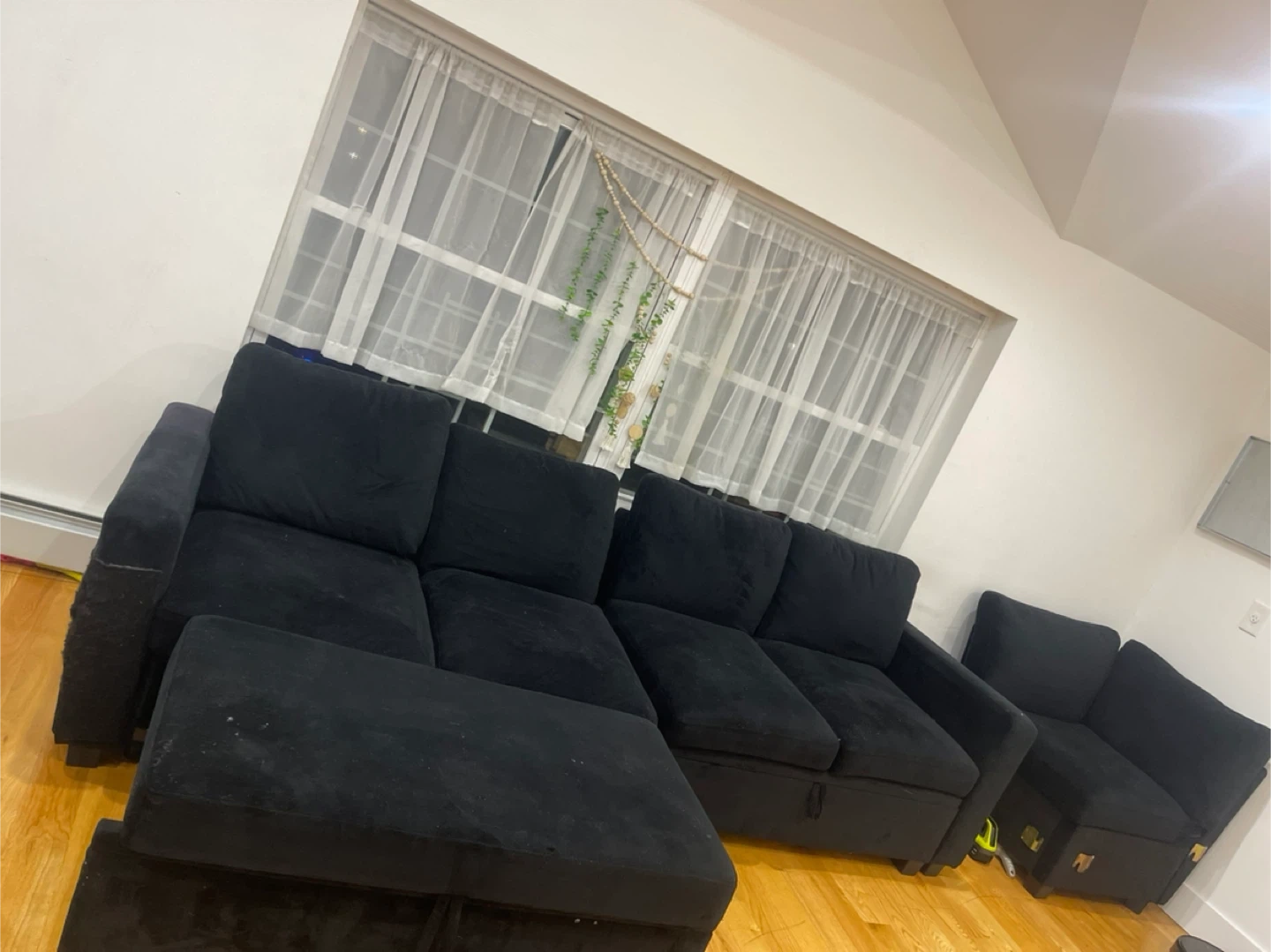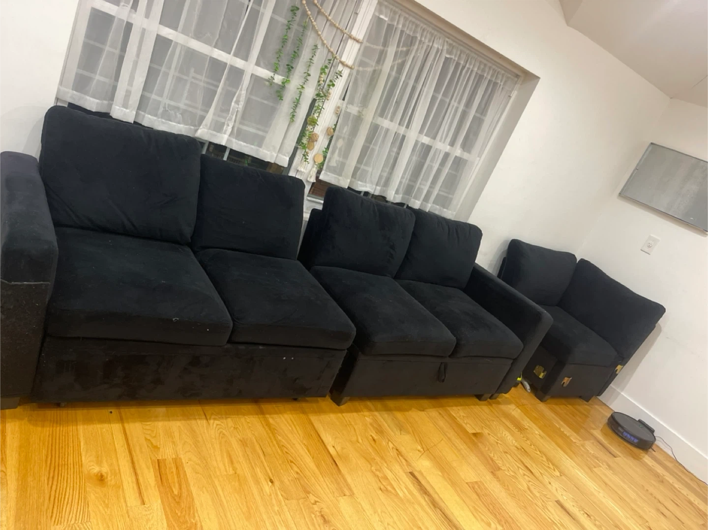 Selling a comfortable black sectional sofa. It features convenient storage compartments within the seating. Great for maximizing space and keeping things organized! Looks and feels new. Only used for 6 months.