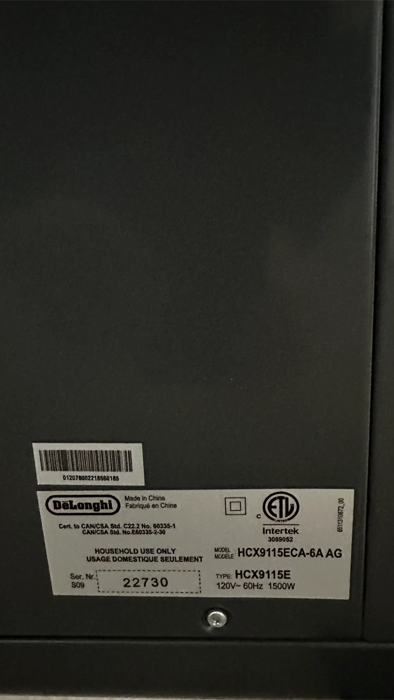 Selling a DeLonghi HCX9115ECA-6A AG heater! It's a sleek and efficient way to keep your space warm and cozy. This model is designed for household use and operates at 120V-60Hz with 1500W power.