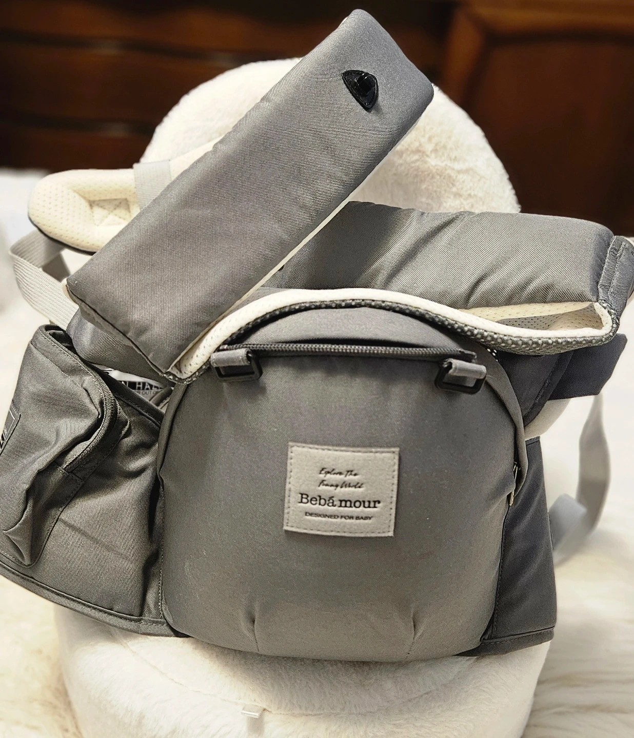 Selling a Pre-Loved Bebamour hip seat carrier in excellent condition! It's a versatile and comfortable way to carry your baby. The carrier is grey and features a multi-functional design. Perfect for parents on the go!