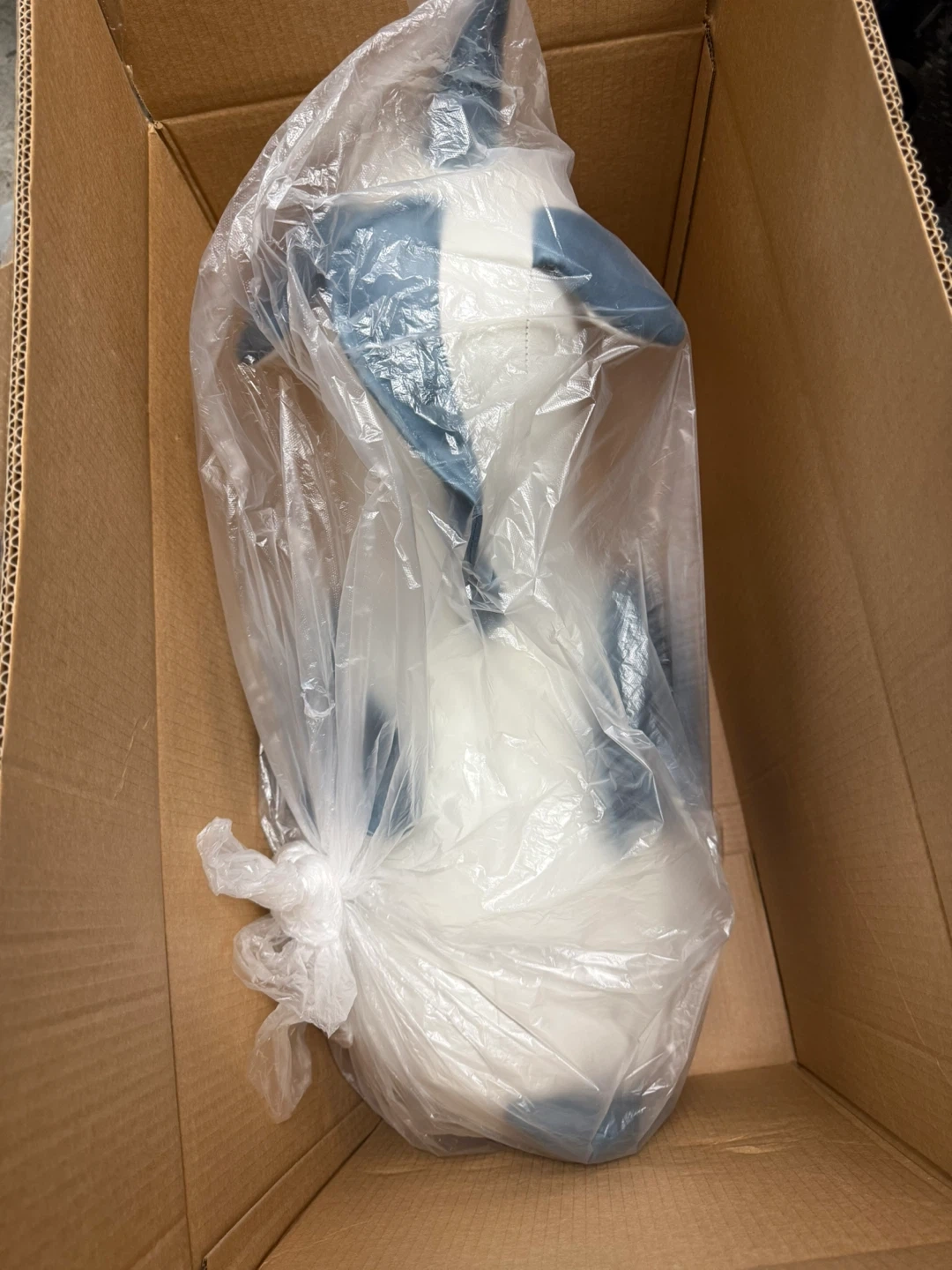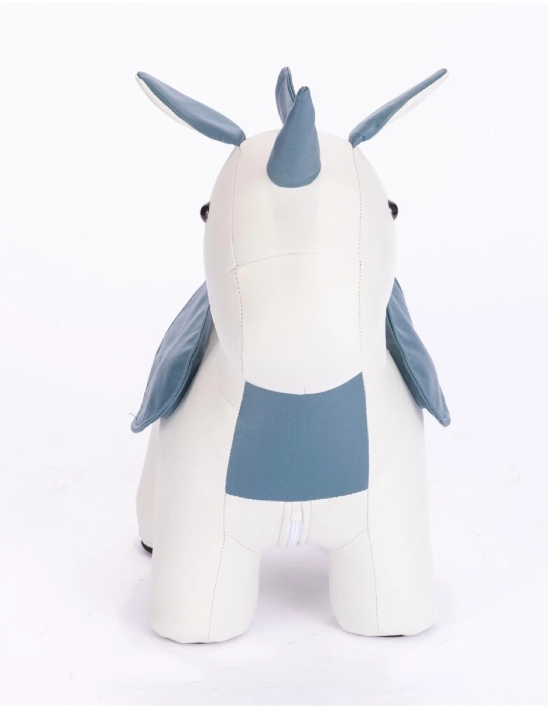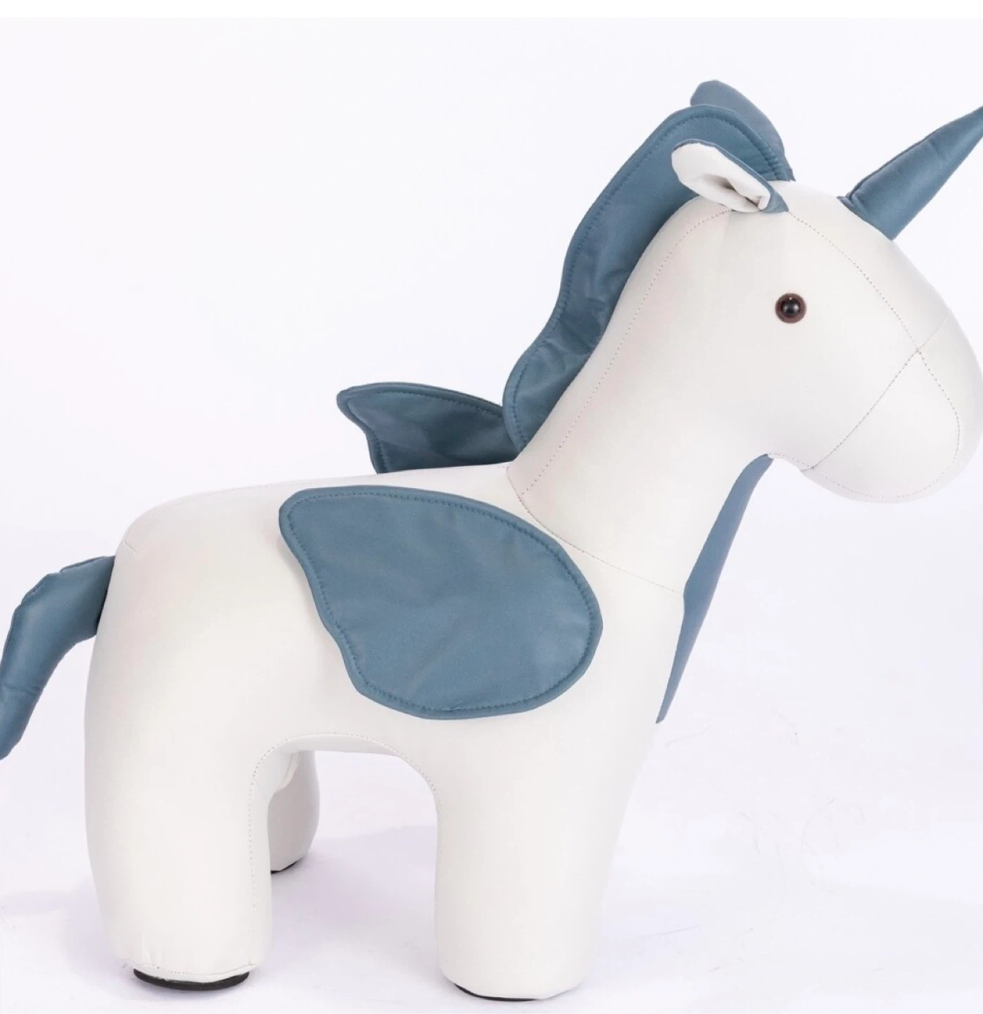 This adorable unicorn ottoman is brand new and still in its box! It features a white body with blue accents and is made of soft material, perfect for a child's room or playroom. The ottoman measures approximately 27.56" in height, 29.92" in length, and 15.6" in width. It's a cute and functional piece of decor!