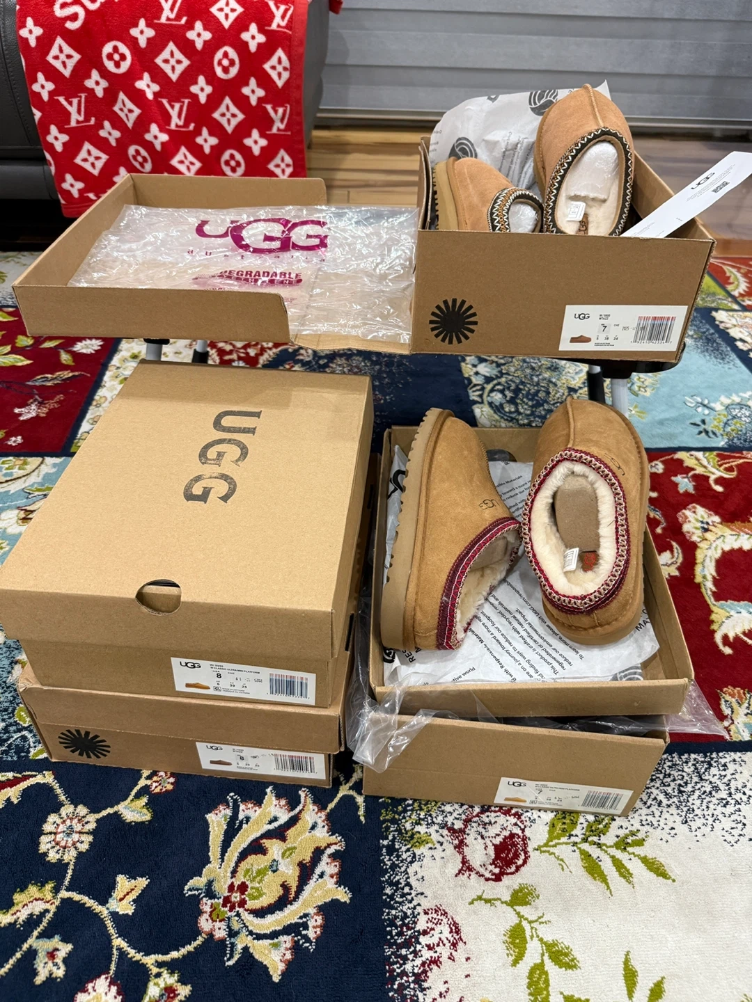 UGG Tasman slippers for women, size 7 and 8 . These are in great condition and come with the original box. They're super comfy and perfect for wearing around the house. The slippers are a stylish tan colour. Get ready for cozy season!