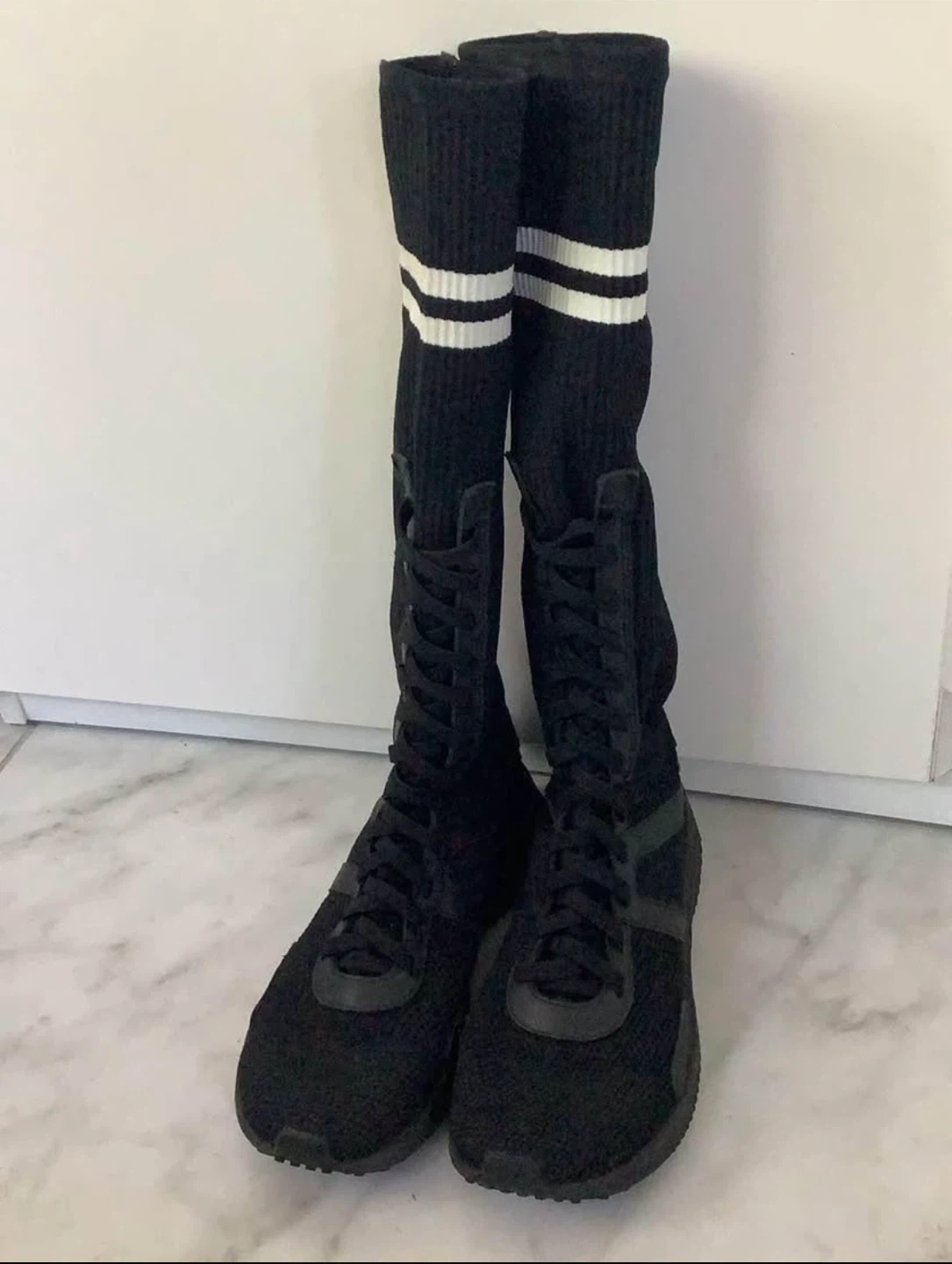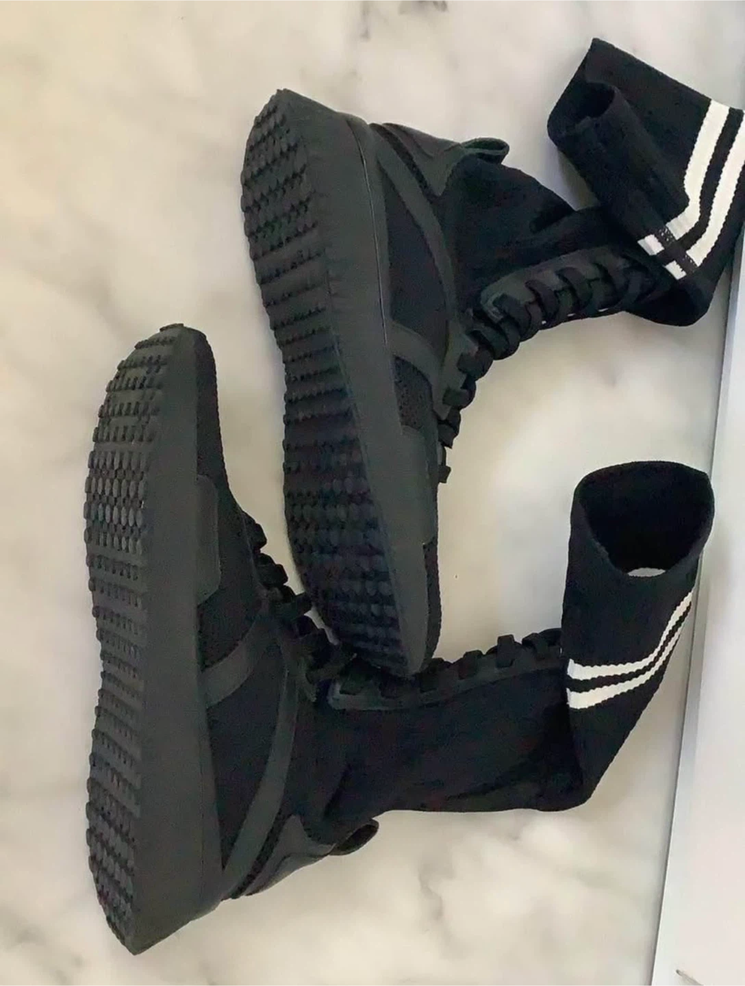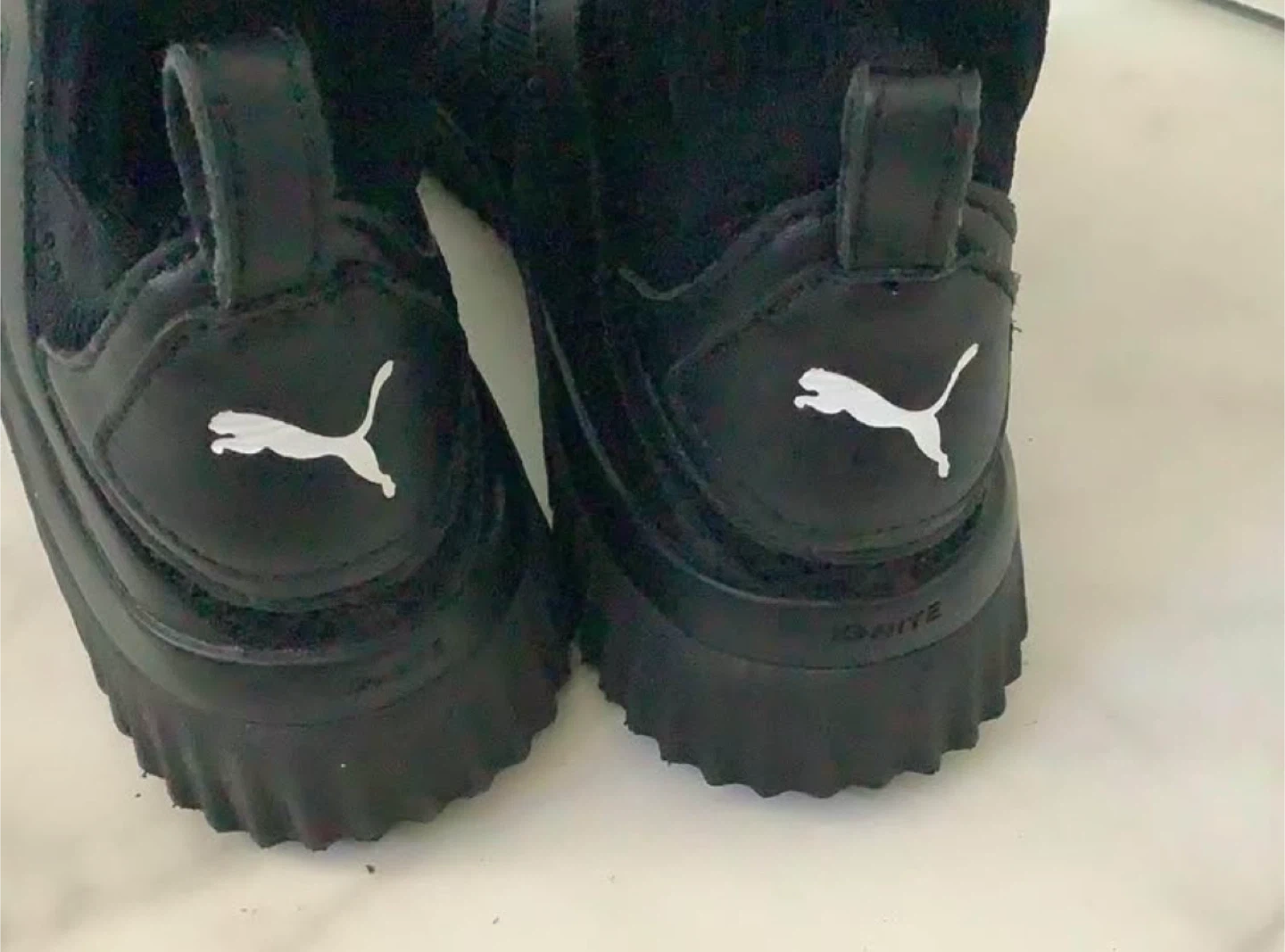 These are a pair of Puma Deva Boot Sock shoes in black. They feature a sock-like upper and lace-up closure for a secure fit. The design includes the classic Puma logo.