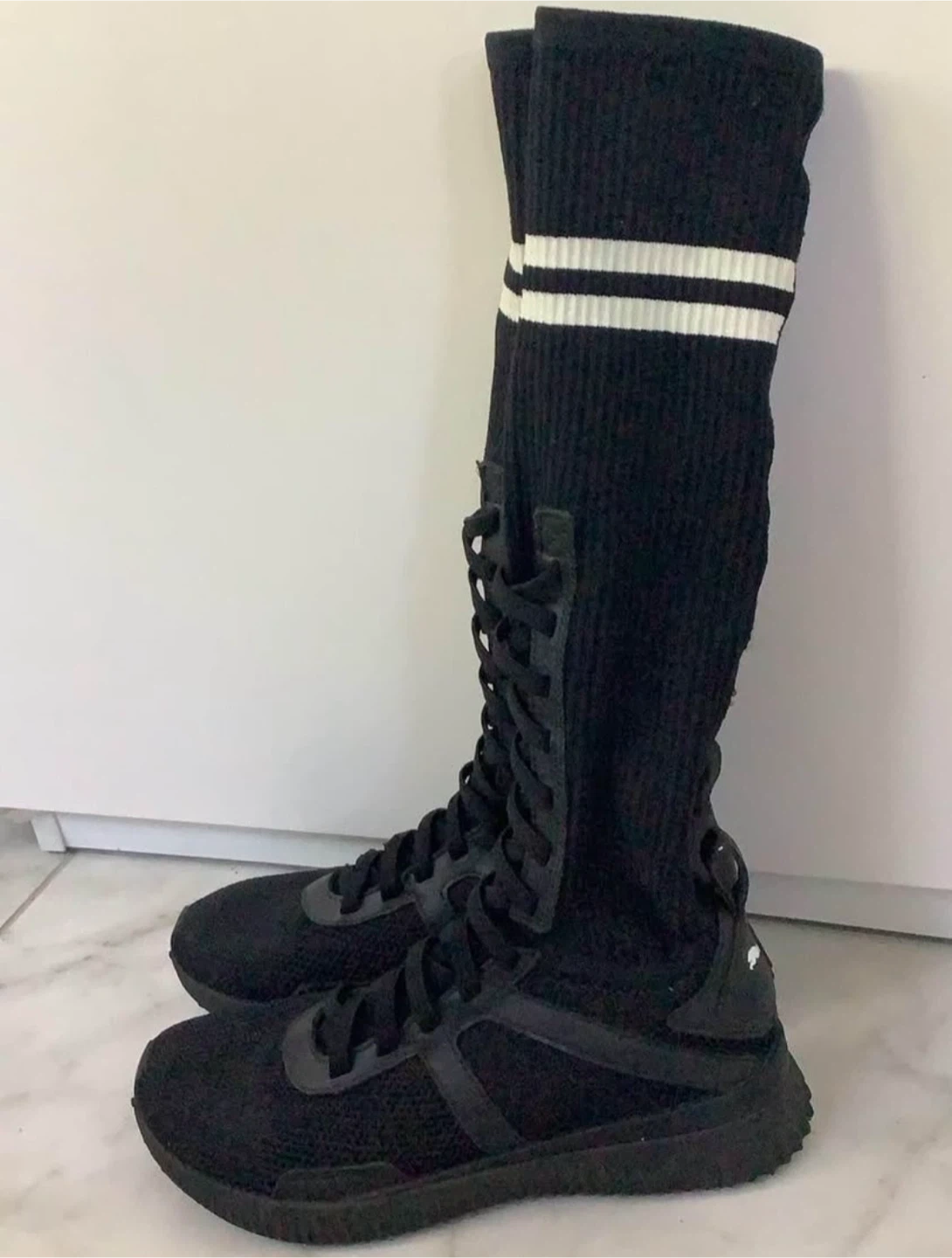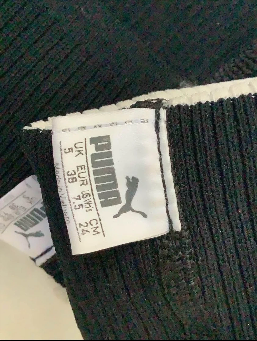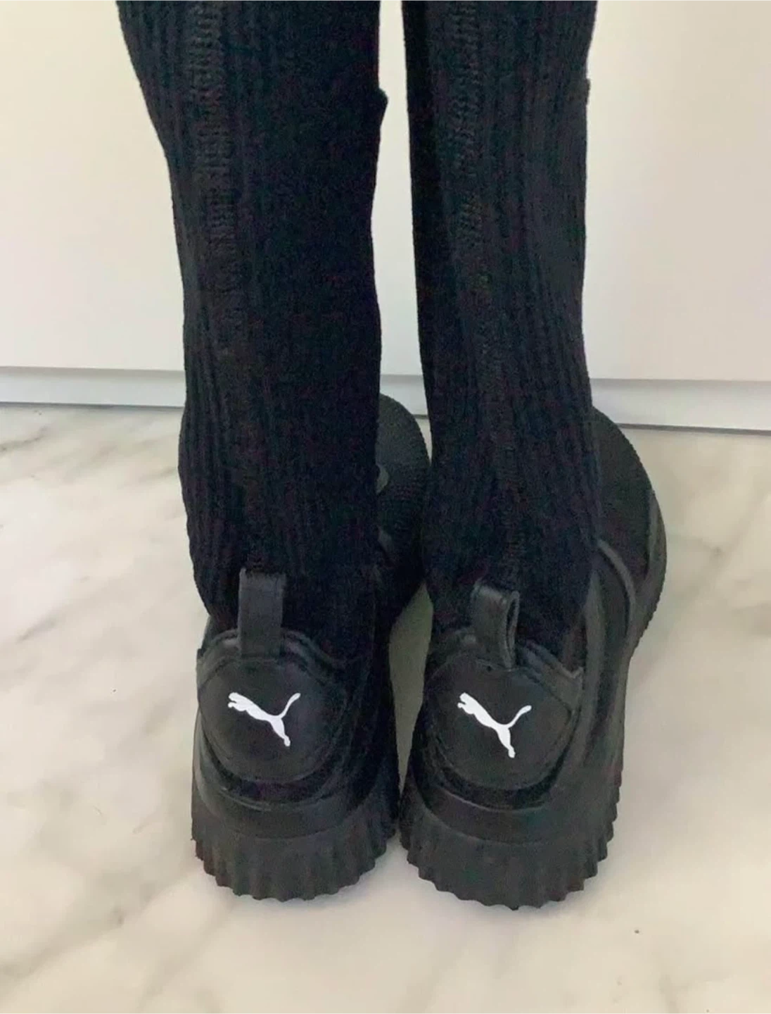 These are a pair of Puma Deva Boot Sock shoes in black. They feature a sock-like upper and lace-up closure for a secure fit. The design includes the classic Puma logo.