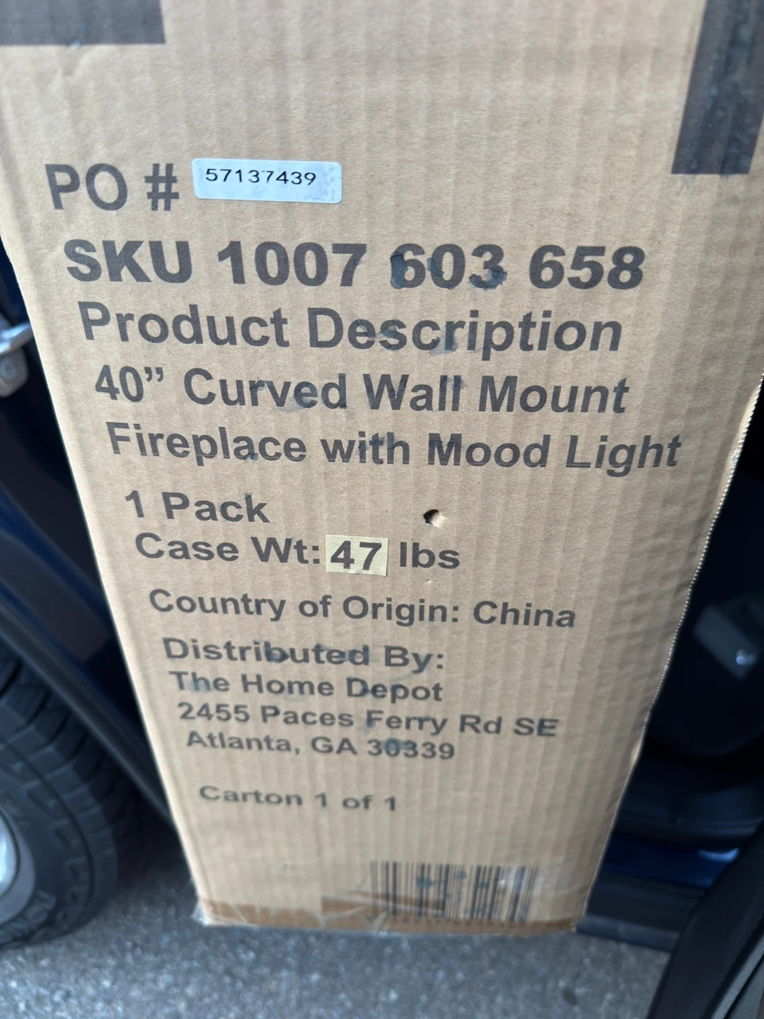 Selling a 40-inch curved wall mount fireplace with mood light. It's brand new, still in the box and ready to add some warmth and ambiance to your space. It comes with a remote control for easy operation. The dimensions are approximately 40 inches wide, 18 inches high, and 6.18 inches deep