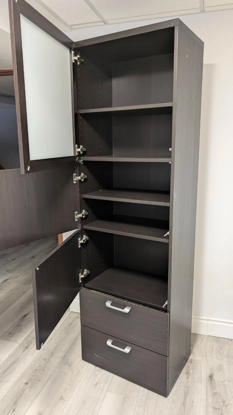 Selling a tall brown cabinet with a combination of shelves and drawers. It's great for extra storage and keeping things organized. Perfect for any room in the house