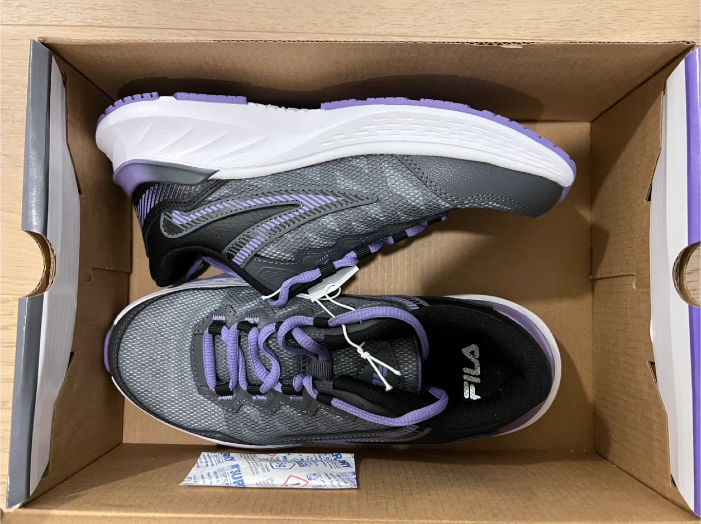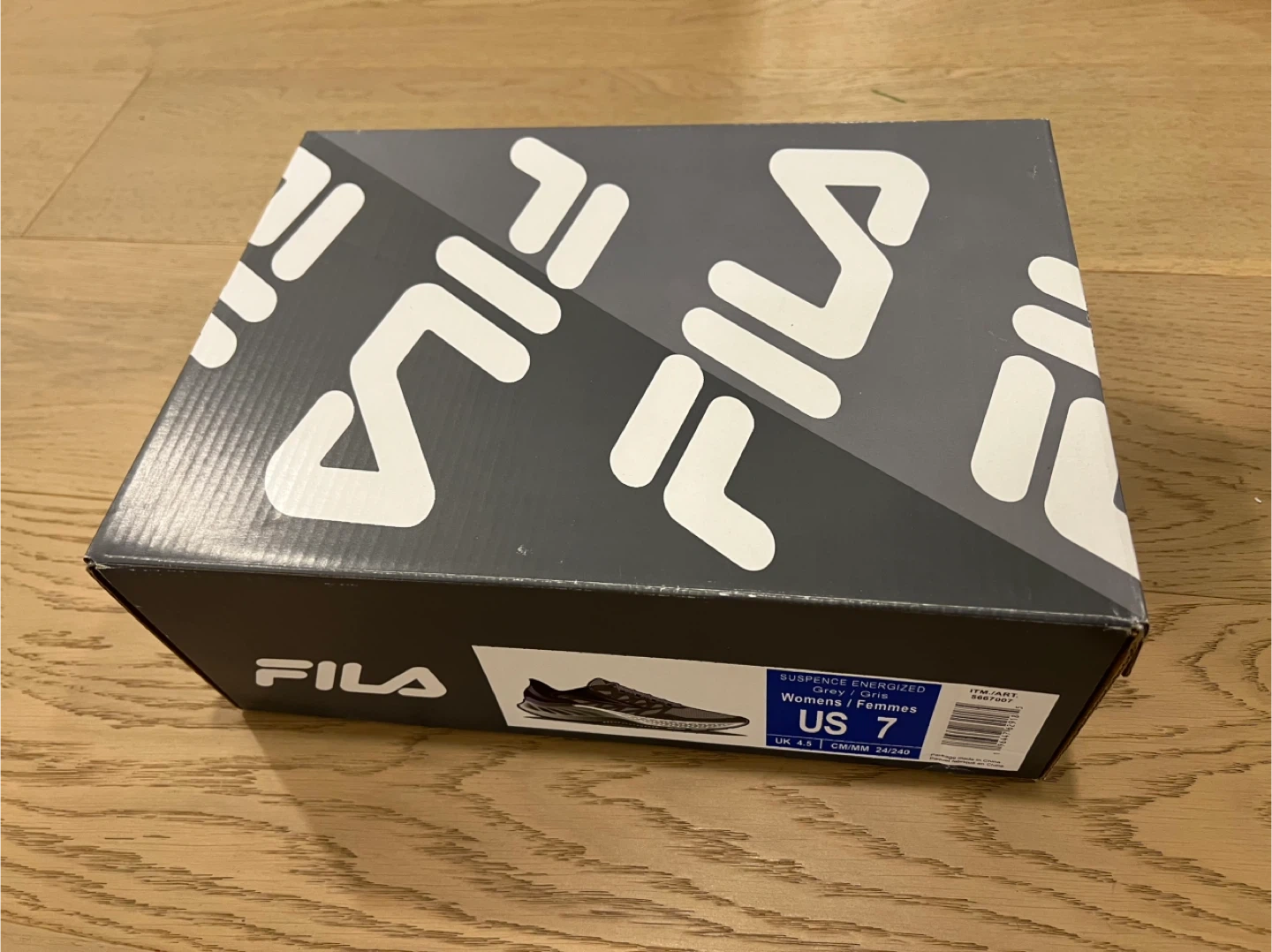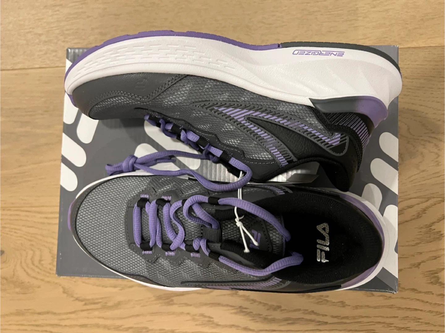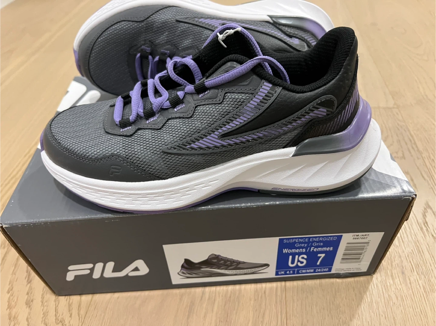 Selling a pair of Fila Suspence Energized women's running shoes in size 7. They are a stylish grey and purple colour. Comes with the original box!