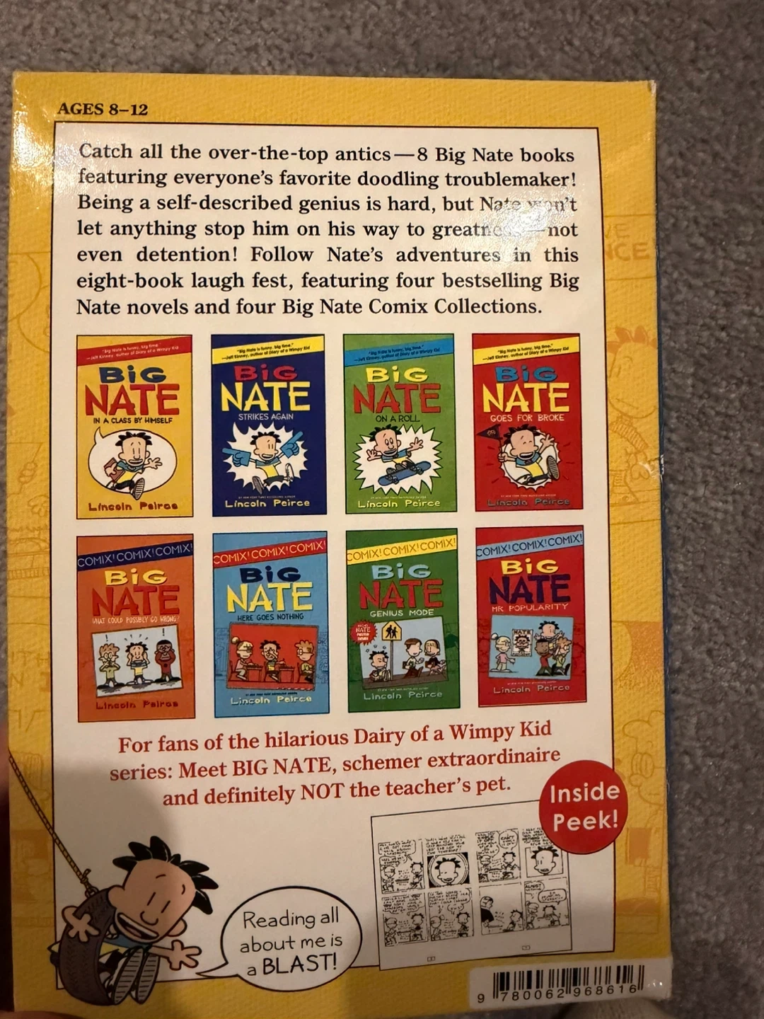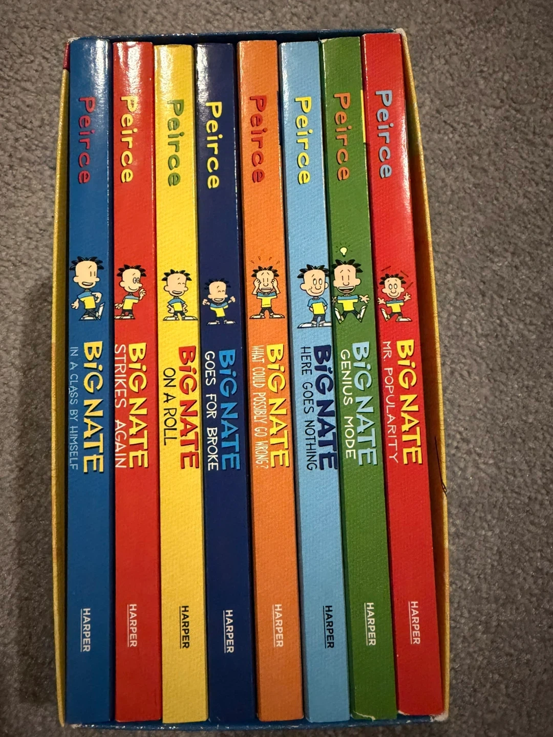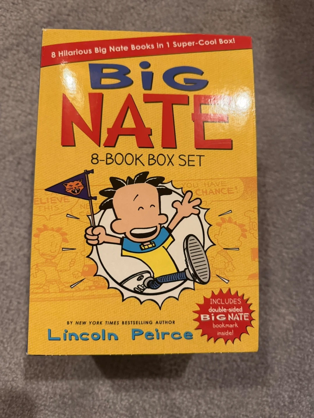 Selling a Big Nate 8-Book Box Set by Lincoln Peirce! This set includes eight hilarious Big Nate books in one super-cool box. It also includes a double-sided Big Nate bookmark inside. Recommended for ages 8-12, it features everyone's favourite doodling troublemaker