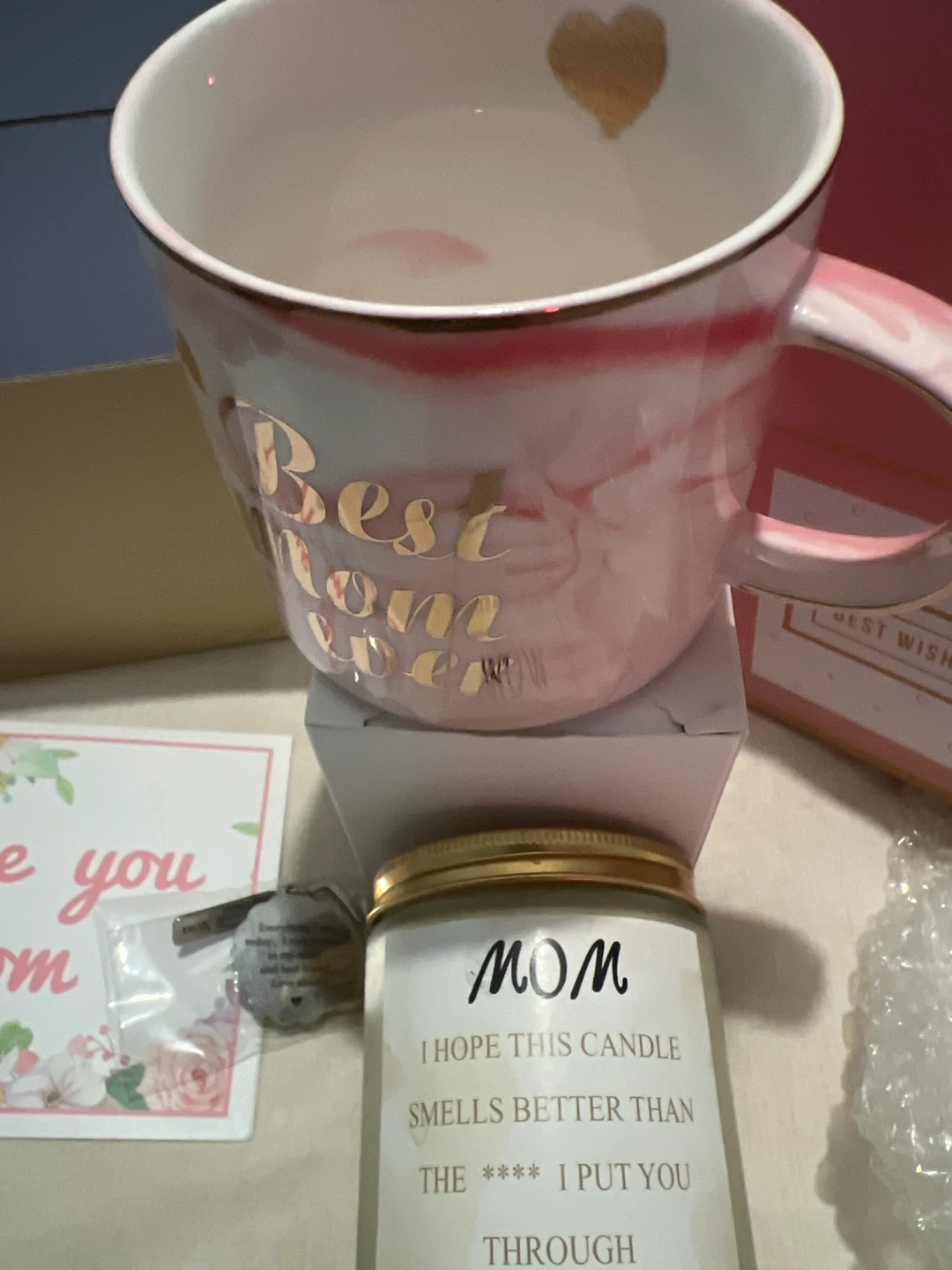 Selling a brand new "Best Wishes for You" gift set! It includes a mug, candle, keyring, and a card. The candle says, "MOM I HOPE THIS CANDLE SMELLS BETTER THAN THE **** I PUT YOU THROUGH SOY WAX CANDLES NET WT. 6.3 OZ". Comes in its original box.