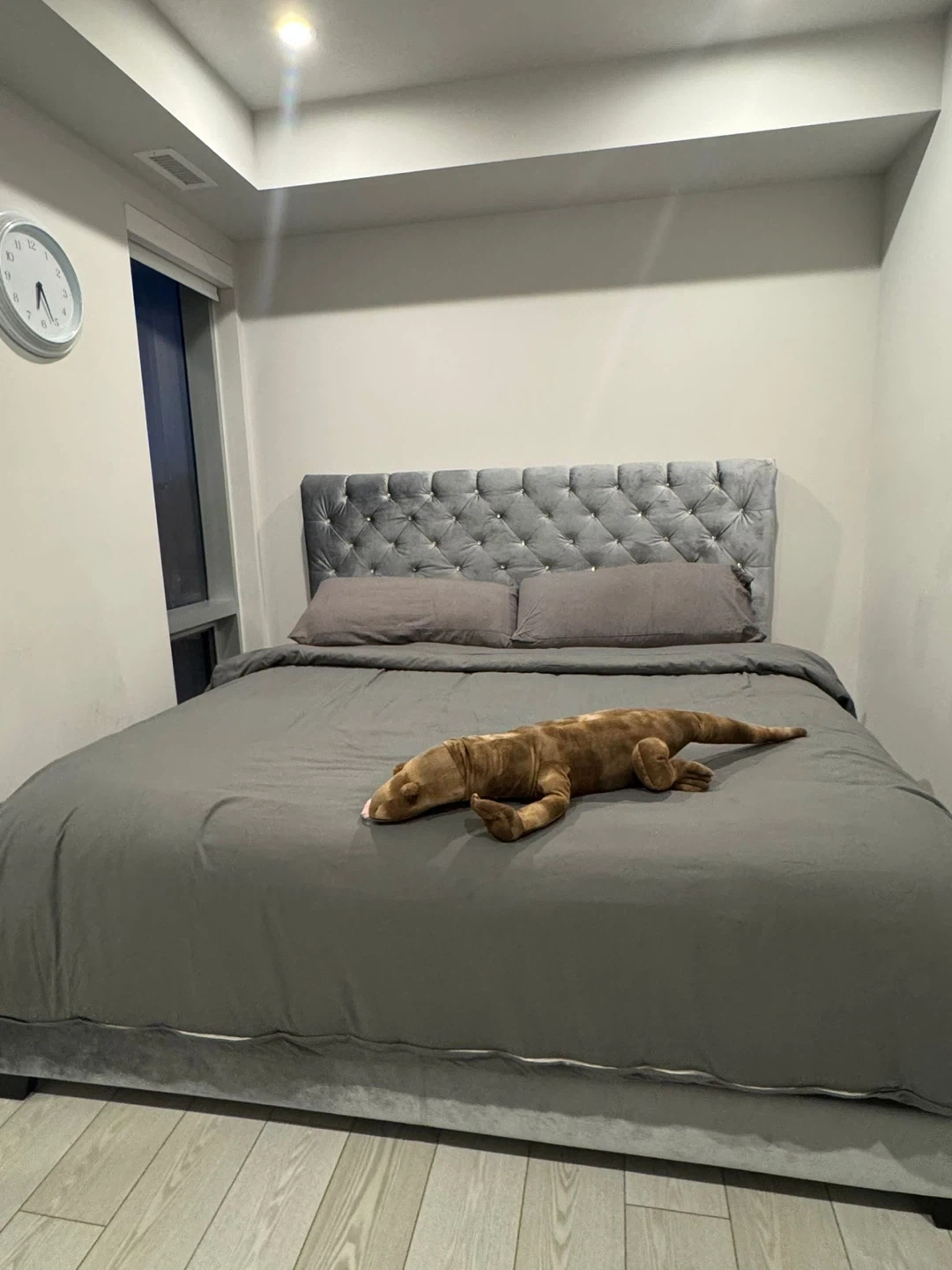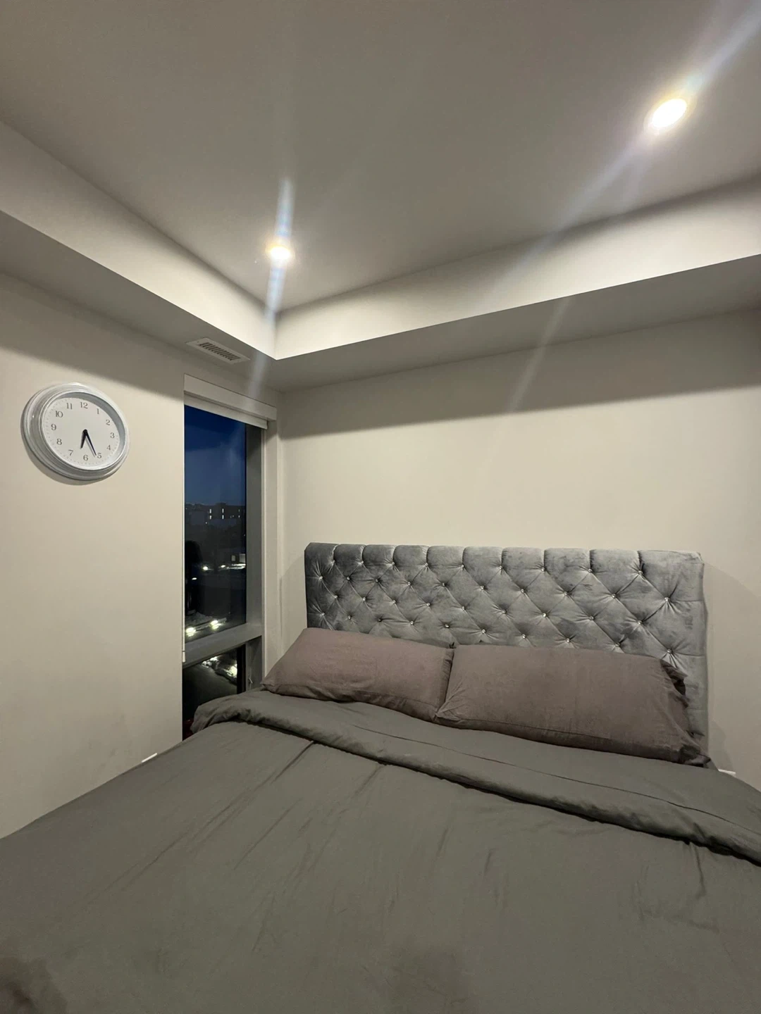 Beautiful Queen size bed set including bed frame, mattress, and tufted velvet headboard in an elegant grey tone.