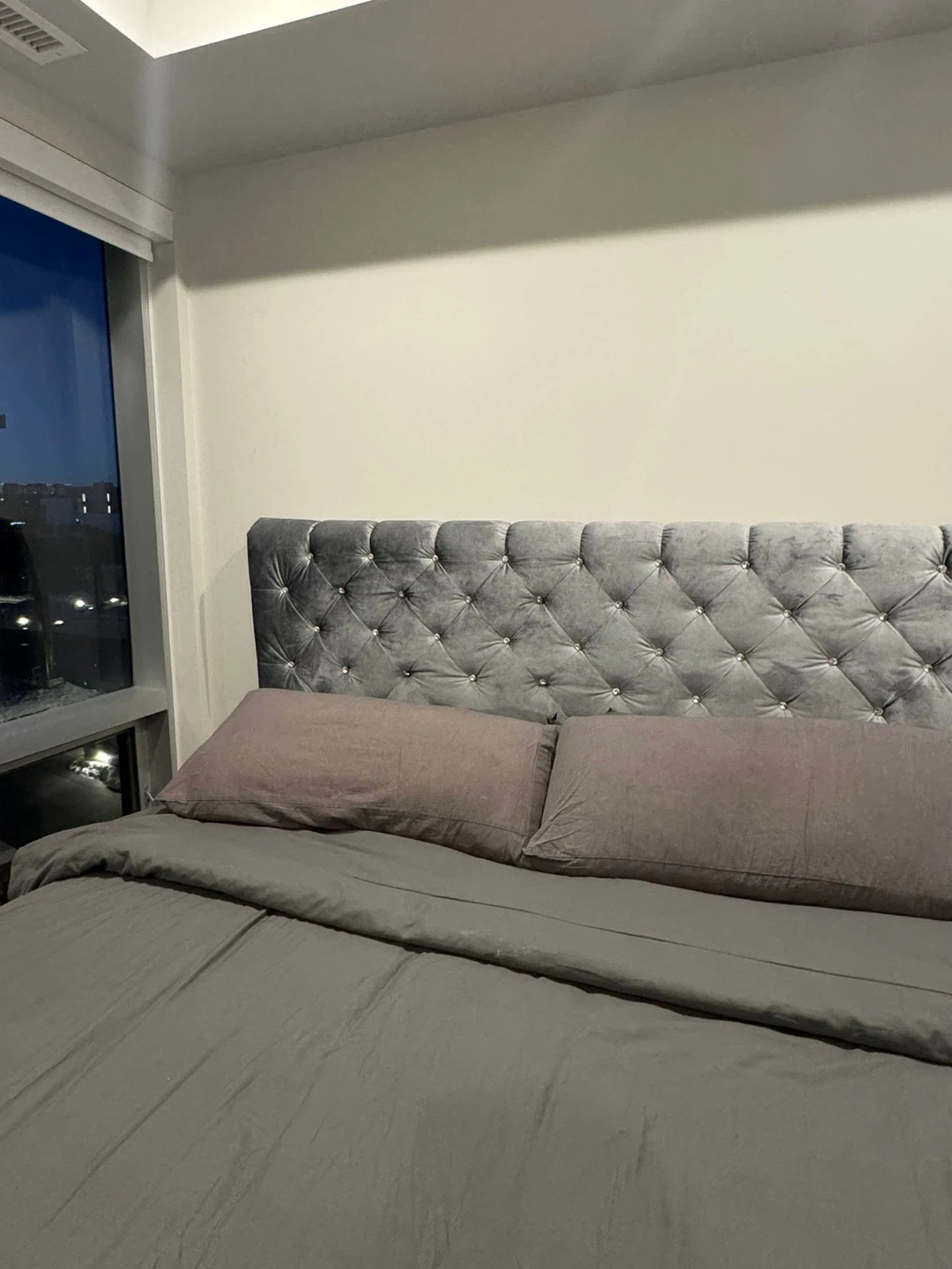 Beautiful Queen size bed set including bed frame, mattress, and tufted velvet headboard in an elegant grey tone.