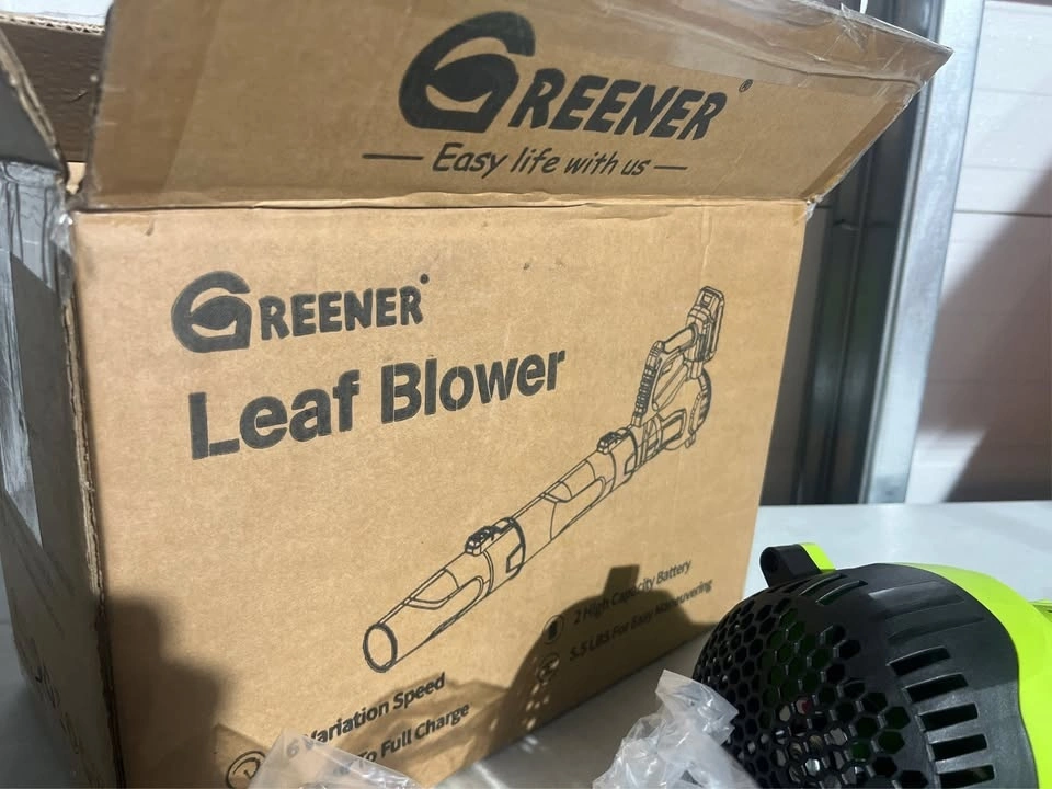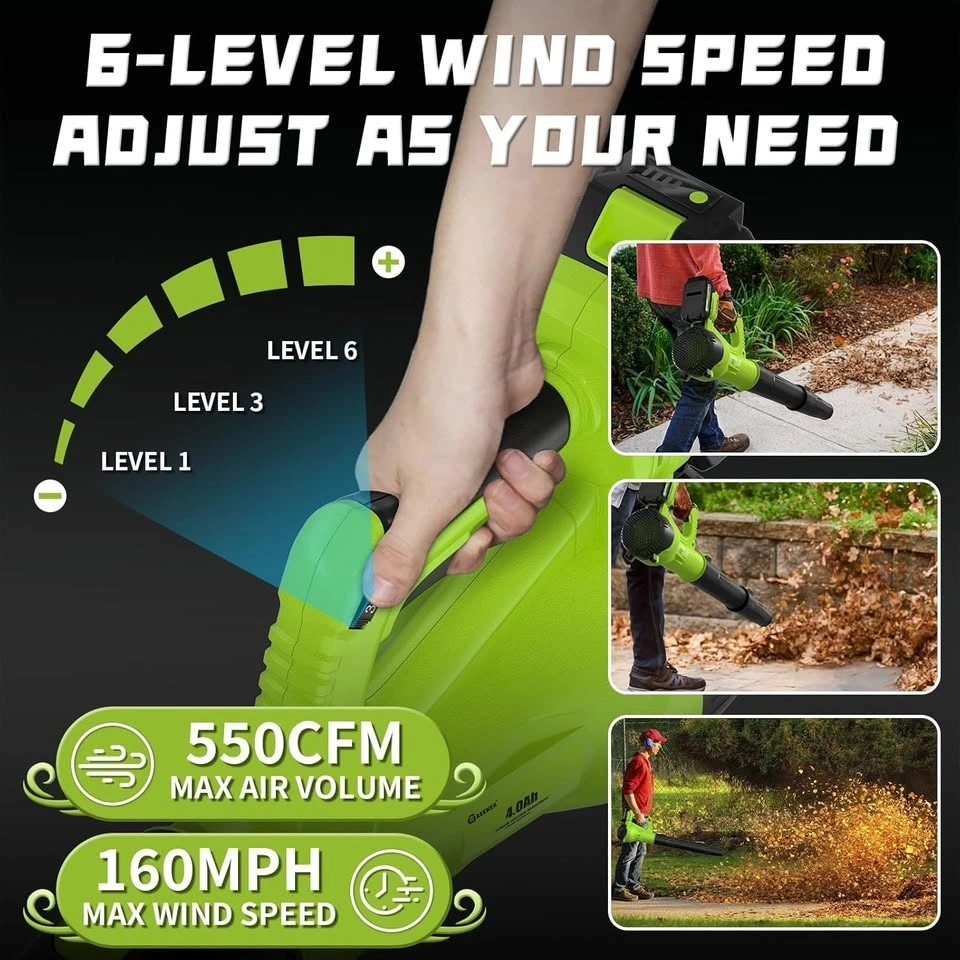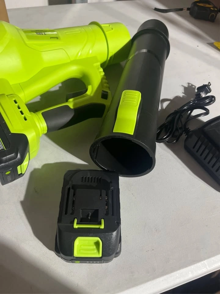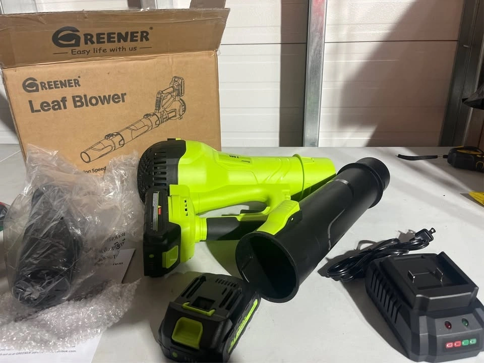 Dual 21V 2.0Ah Batteries. The dual-battery facilitates alternating use, enabling continuous operation for up to 50 minutes in high-speed mode (25 minutes per battery). Two powerful batteries ensure uninterrupted yard work efficiency. This cordless leaf blower provides complete freedom of movement, making it ideal for tackling large yards and those tricky, hard-to-reach areas. Weighing in at just 5.5 lbs, its lightweight design enables comfortable one-handed operation. Additionally, it features a convenient trigger lock to maintain your desired speed, from swift cleanups to extended gardening sessions delivering both flexibility and efficiency for all your outdoor chores. The GREENER portable leaf blower features 6 customizable speed settings that accelerates airspeed to an impressive 160 MPH, allowing you to tailor the airflow to the intensity of your cleaning tasks. With an automatic speed lock feature, you can free up your hands while you work. Whether you're clearing light debris or tackling heavy leaf piles, with 550 CFM effortlessly switch between speeds to match the job at hand. This electric leaf blower features two tubes that can easily be extended or utilized independently. The GREENER battery leaf blower can be assembled in minutes, just install two nozzles and a battery to start the leaf blower. It is perfect for everyday use whether you re clearing leaves from the yard, debris from the deck, or dust and clutter from the garage and porch. The fast charger fully replenishes a battery in just 1 hour, ensuring minimal downtime. Its LED indicator signals red during charging and green when fully charged. Built-in charger diagnostic program provides overheat protection and overcharge protection for battery charging. Additionally, the power indicator light offers clear visibility of the remaining battery life and charging status. To maximize battery lifespan, we recommend fully charging before initial use and allowing a 5-minute cooldown period post-use to prevent overheating. While the battery can be stored for about a year when fully charged, we advise recharging every six months for optimal performance.