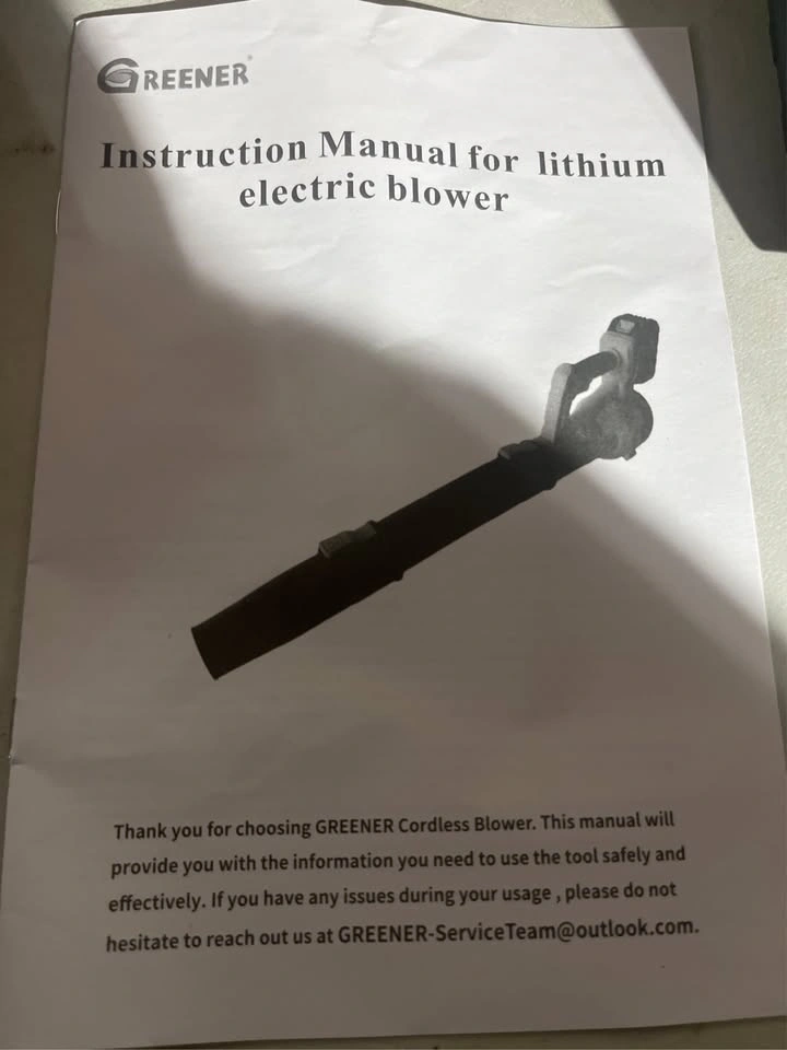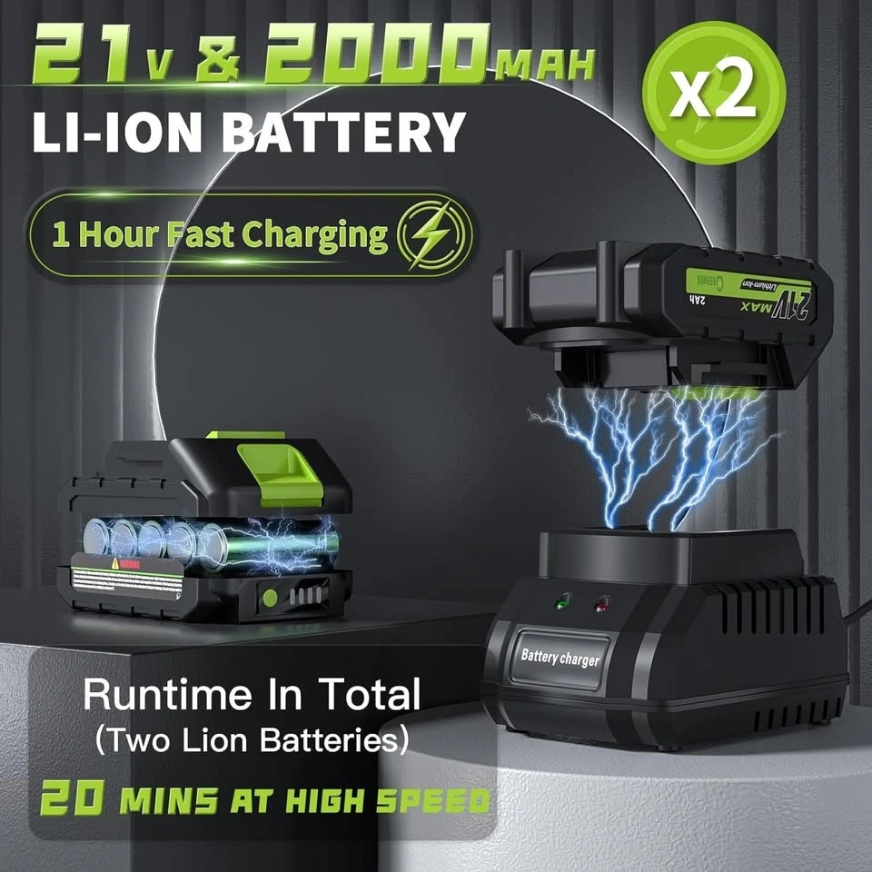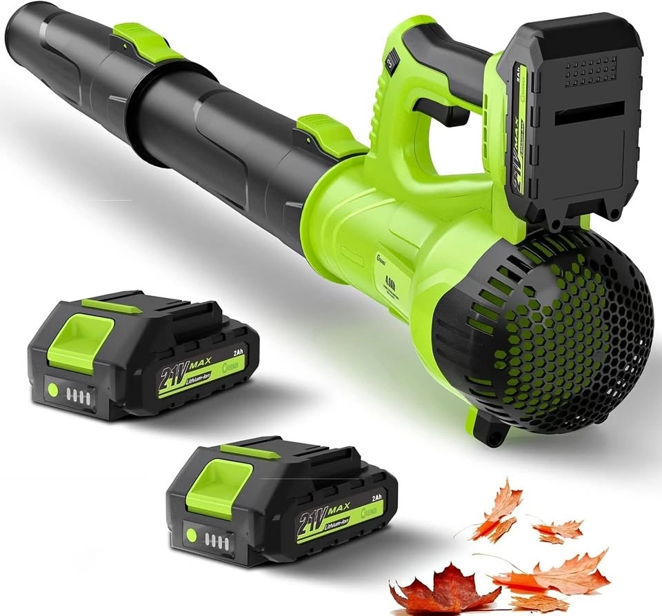 Dual 21V 2.0Ah Batteries. The dual-battery facilitates alternating use, enabling continuous operation for up to 50 minutes in high-speed mode (25 minutes per battery). Two powerful batteries ensure uninterrupted yard work efficiency. This cordless leaf blower provides complete freedom of movement, making it ideal for tackling large yards and those tricky, hard-to-reach areas. Weighing in at just 5.5 lbs, its lightweight design enables comfortable one-handed operation. Additionally, it features a convenient trigger lock to maintain your desired speed, from swift cleanups to extended gardening sessions delivering both flexibility and efficiency for all your outdoor chores. The GREENER portable leaf blower features 6 customizable speed settings that accelerates airspeed to an impressive 160 MPH, allowing you to tailor the airflow to the intensity of your cleaning tasks. With an automatic speed lock feature, you can free up your hands while you work. Whether you're clearing light debris or tackling heavy leaf piles, with 550 CFM effortlessly switch between speeds to match the job at hand. This electric leaf blower features two tubes that can easily be extended or utilized independently. The GREENER battery leaf blower can be assembled in minutes, just install two nozzles and a battery to start the leaf blower. It is perfect for everyday use whether you re clearing leaves from the yard, debris from the deck, or dust and clutter from the garage and porch. The fast charger fully replenishes a battery in just 1 hour, ensuring minimal downtime. Its LED indicator signals red during charging and green when fully charged. Built-in charger diagnostic program provides overheat protection and overcharge protection for battery charging. Additionally, the power indicator light offers clear visibility of the remaining battery life and charging status. To maximize battery lifespan, we recommend fully charging before initial use and allowing a 5-minute cooldown period post-use to prevent overheating. While the battery can be stored for about a year when fully charged, we advise recharging every six months for optimal performance.