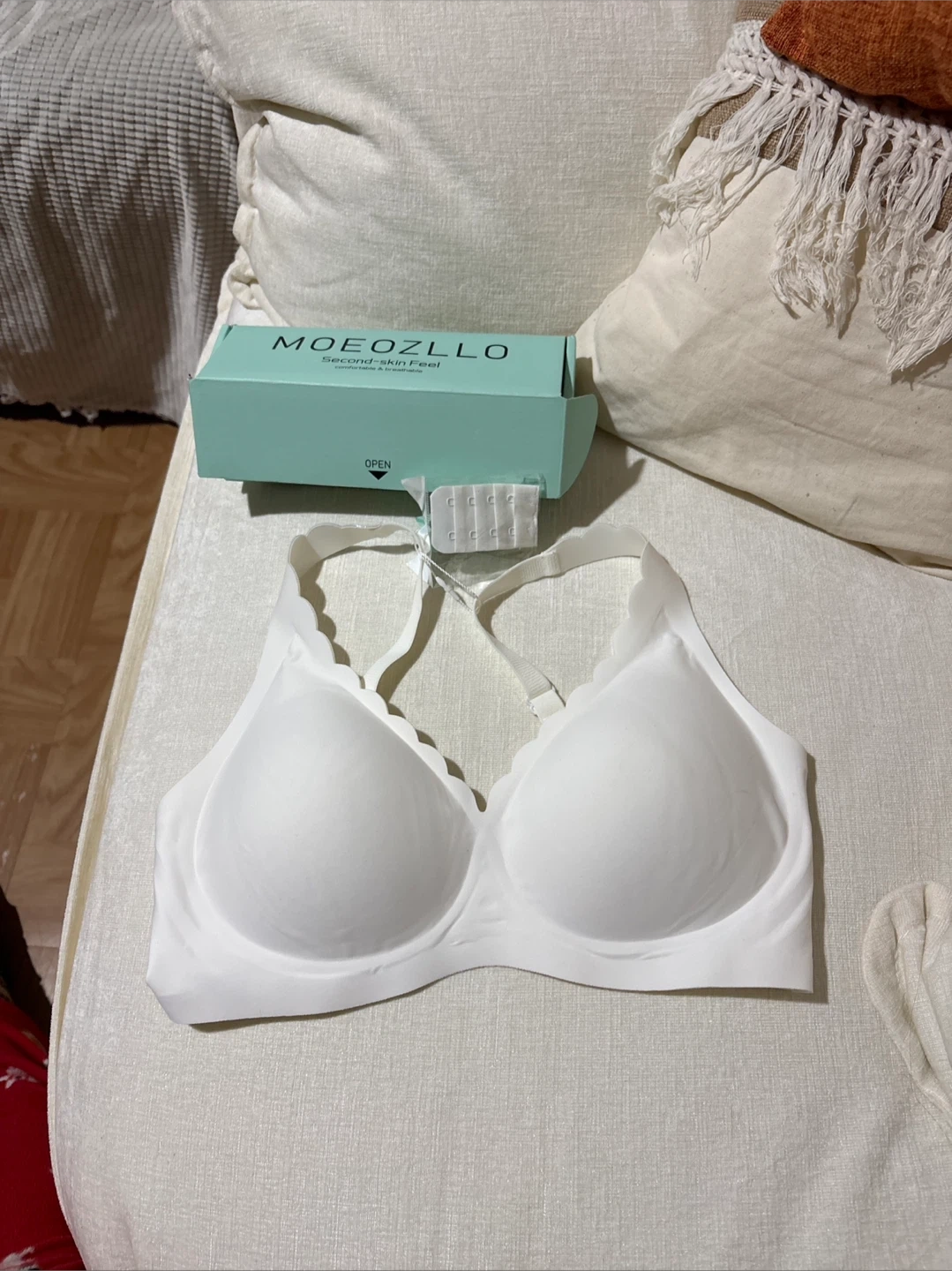 Selling a MOEOOZLLO Second-Skin Feel bra in size S. It's a comfortable and breathable bra with a U-back and back petal trim. The material is 55% nylon and 45% spandex. Includes mobile adjustable shoulder straps. Comes with the original box!