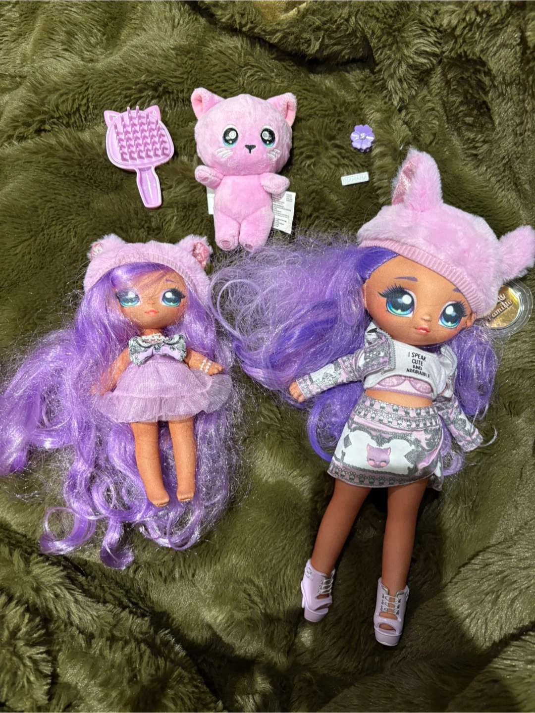 Selling a Na! Na! Na! Surprise Family Soft Doll Set. This set includes two fashion dolls and one pet. The dolls have beautiful purple hair and stylish outfits. The larger doll's shirt reads 'I SPEAK CUTE AND ADORABLE'. Missing one pair of boots for the smaller doll