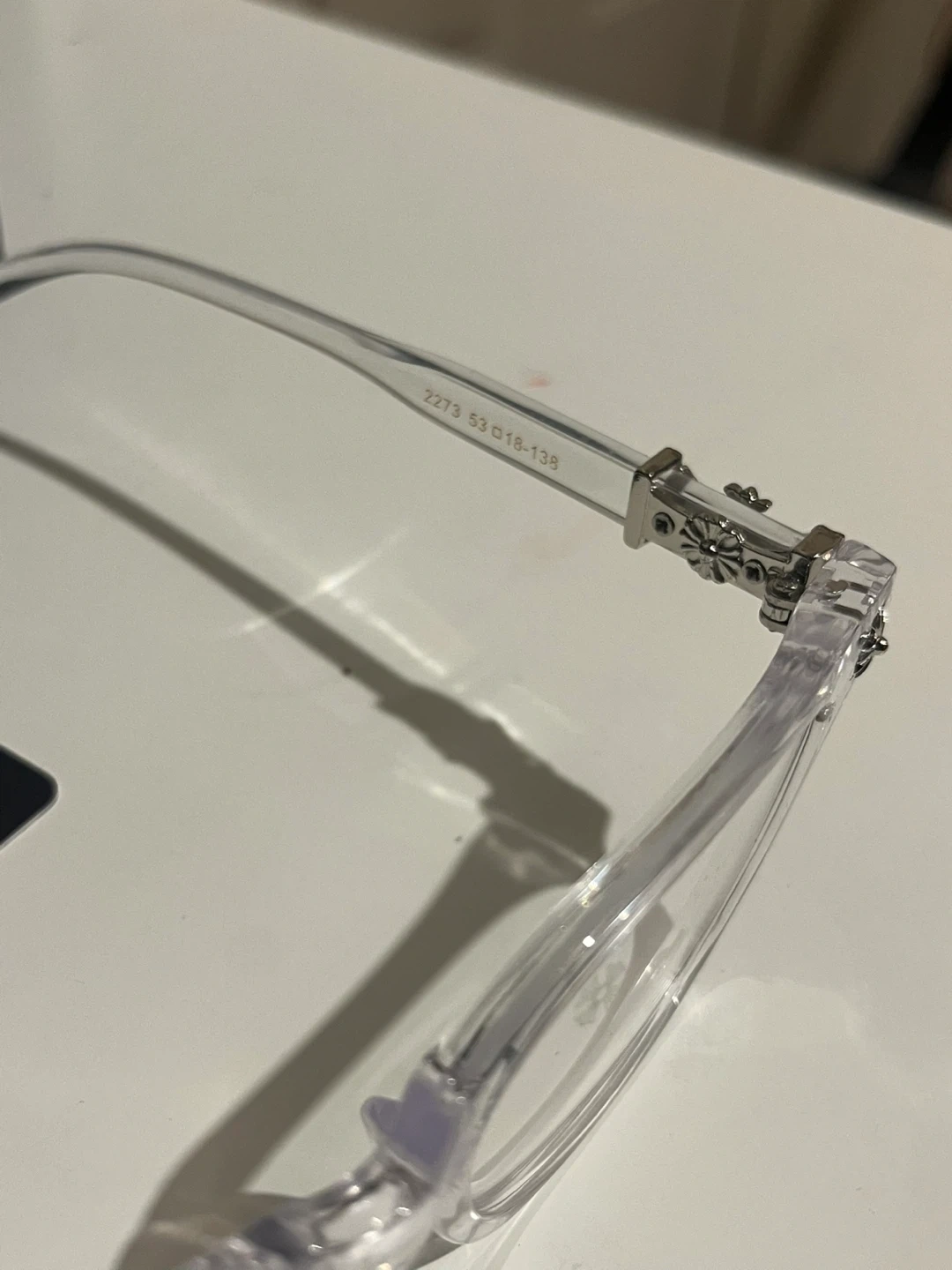 Selling a pair of Chrome Hearts eyeglasses in black gold and silver and clear sliver and gold . The eyeglasses are made in Italy.
