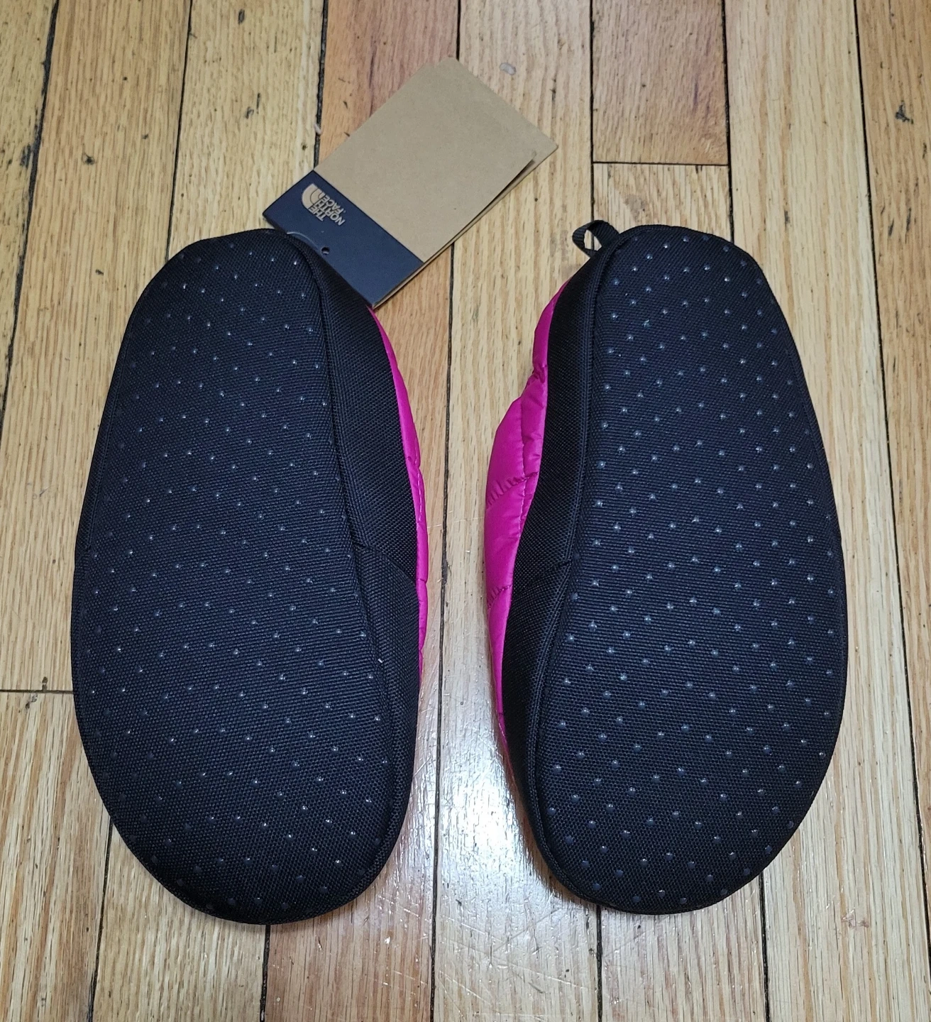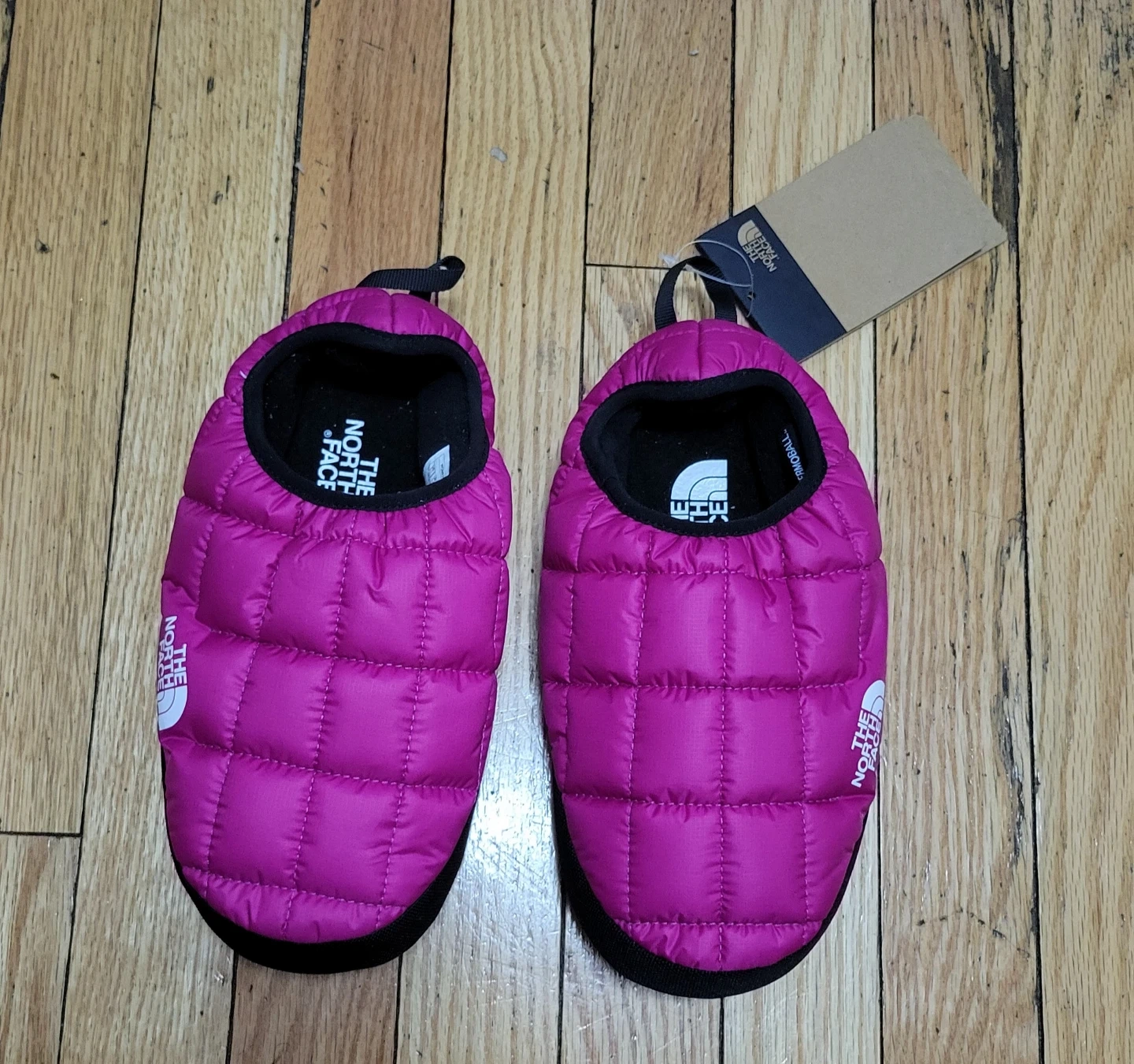 Selling a pair of The North Face Thermoball slippers in women's size XS. They are a vibrant pink color and in great condition. These slippers are perfect for keeping your feet warm and cozy!