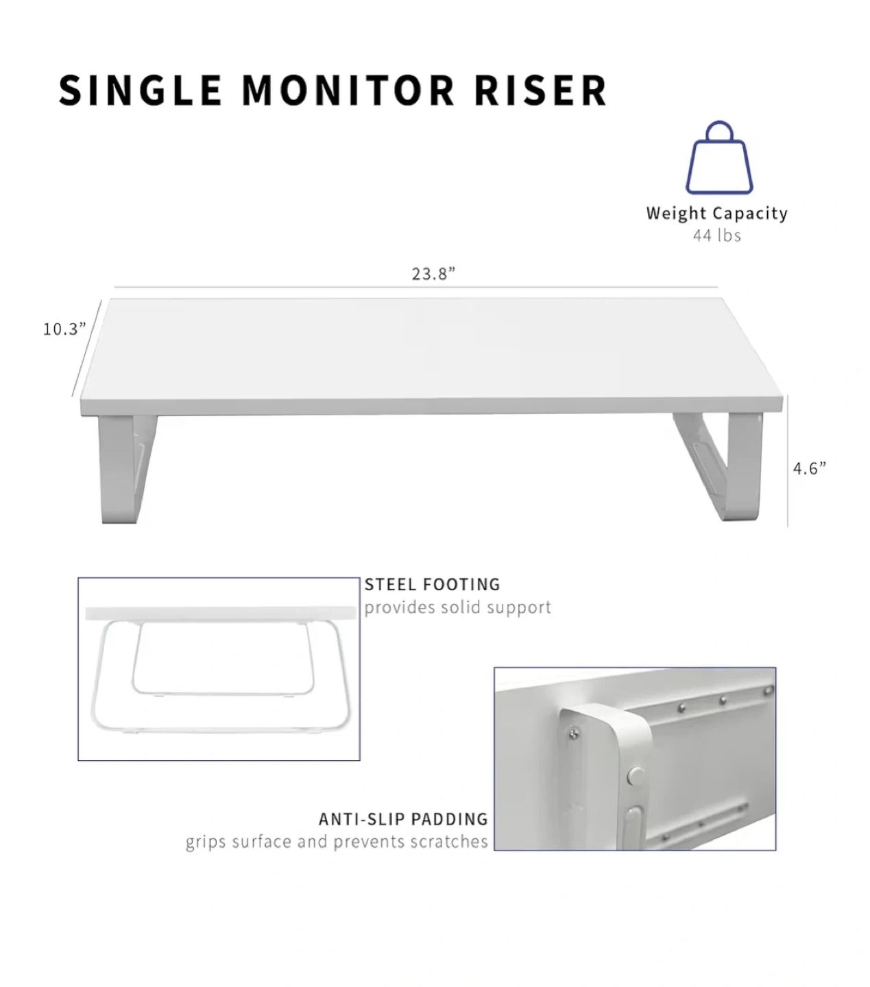 Selling a white monitor riser, perfect for decluttering your workspace! It's 24 inches wide, providing ample space for your monitor and accessories. The steel footing ensures solid support, and the anti-slip padding grips surfaces to prevent scratches. It can hold up to 44 lbs