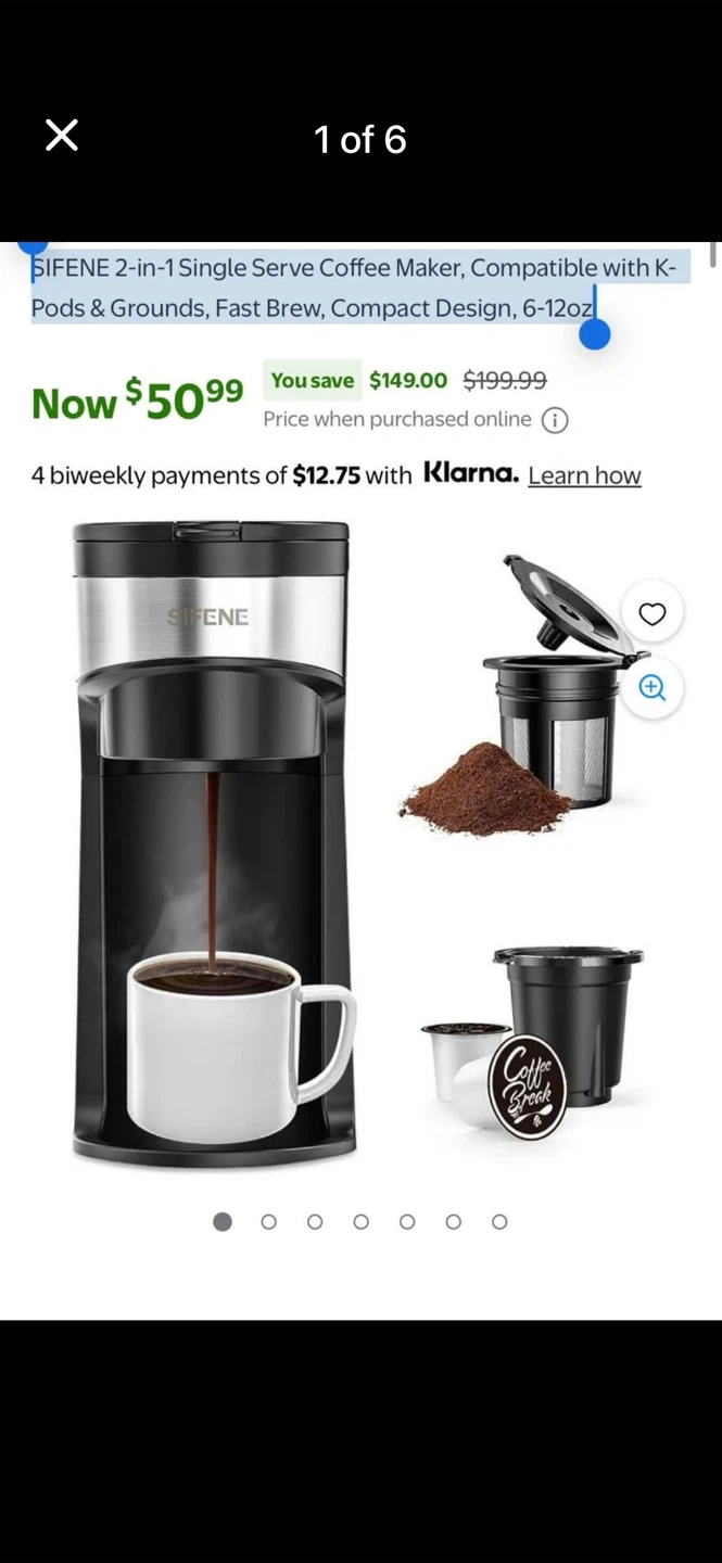 Selling a SIFENE 2-in-1 single serve coffee maker! It's compatible with K-pods and grounds, and features fast brewing and a compact design. It can brew 6-12oz of coffee. The brew basket has a stainless steel filter net. The parts are removable and dishwasher safe