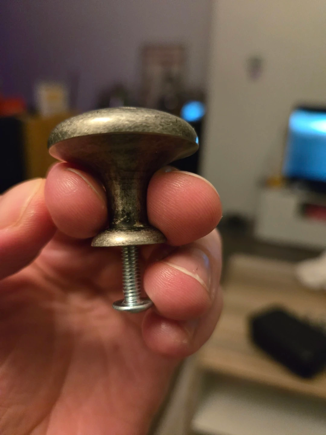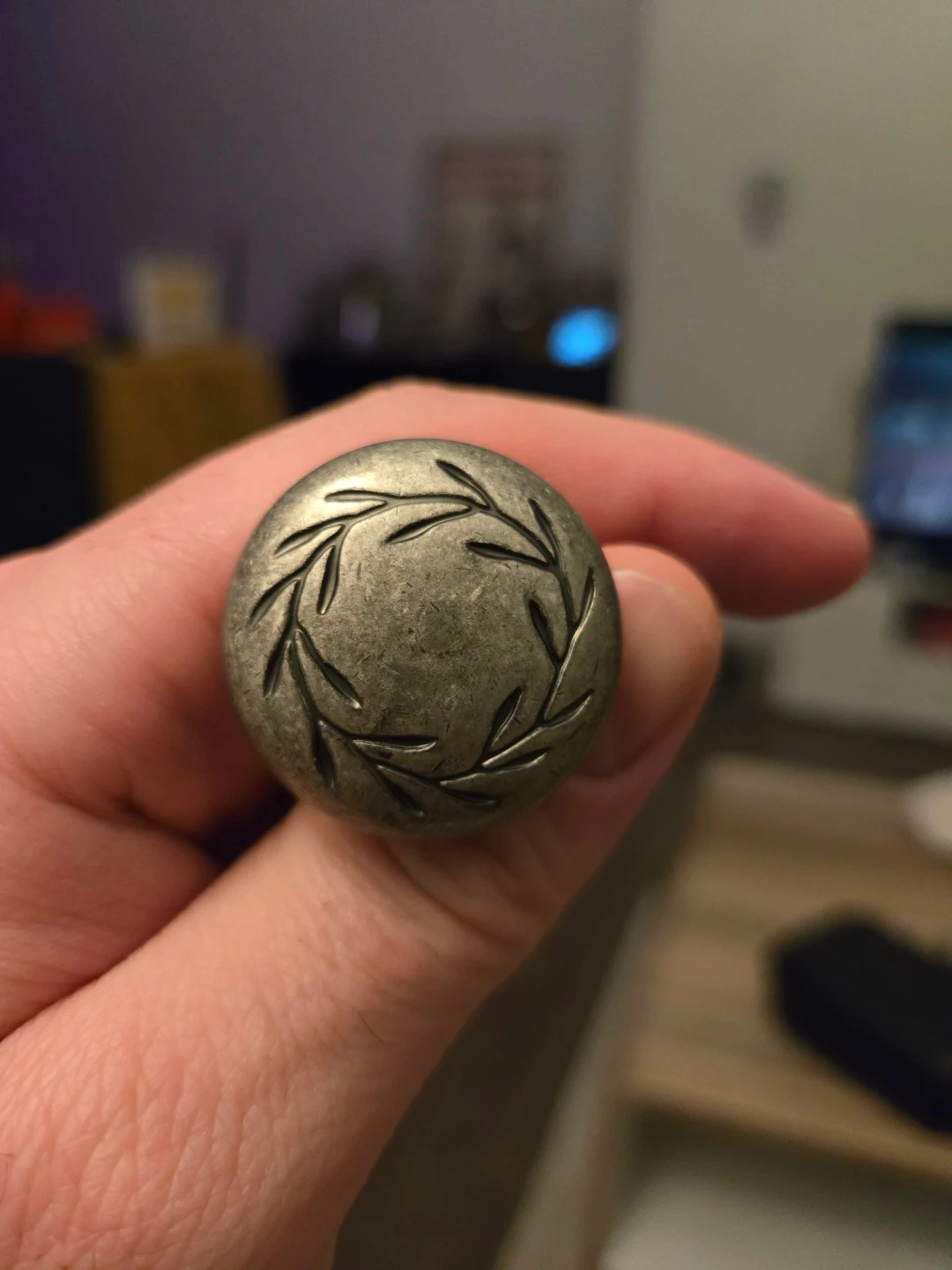 Here's a lovely vintage-style cabinet knob! It features a decorative design on the front and comes with its screw for easy installation. Perfect for adding a touch of antique charm to your furniture or cabinets. I have a dozen of them.