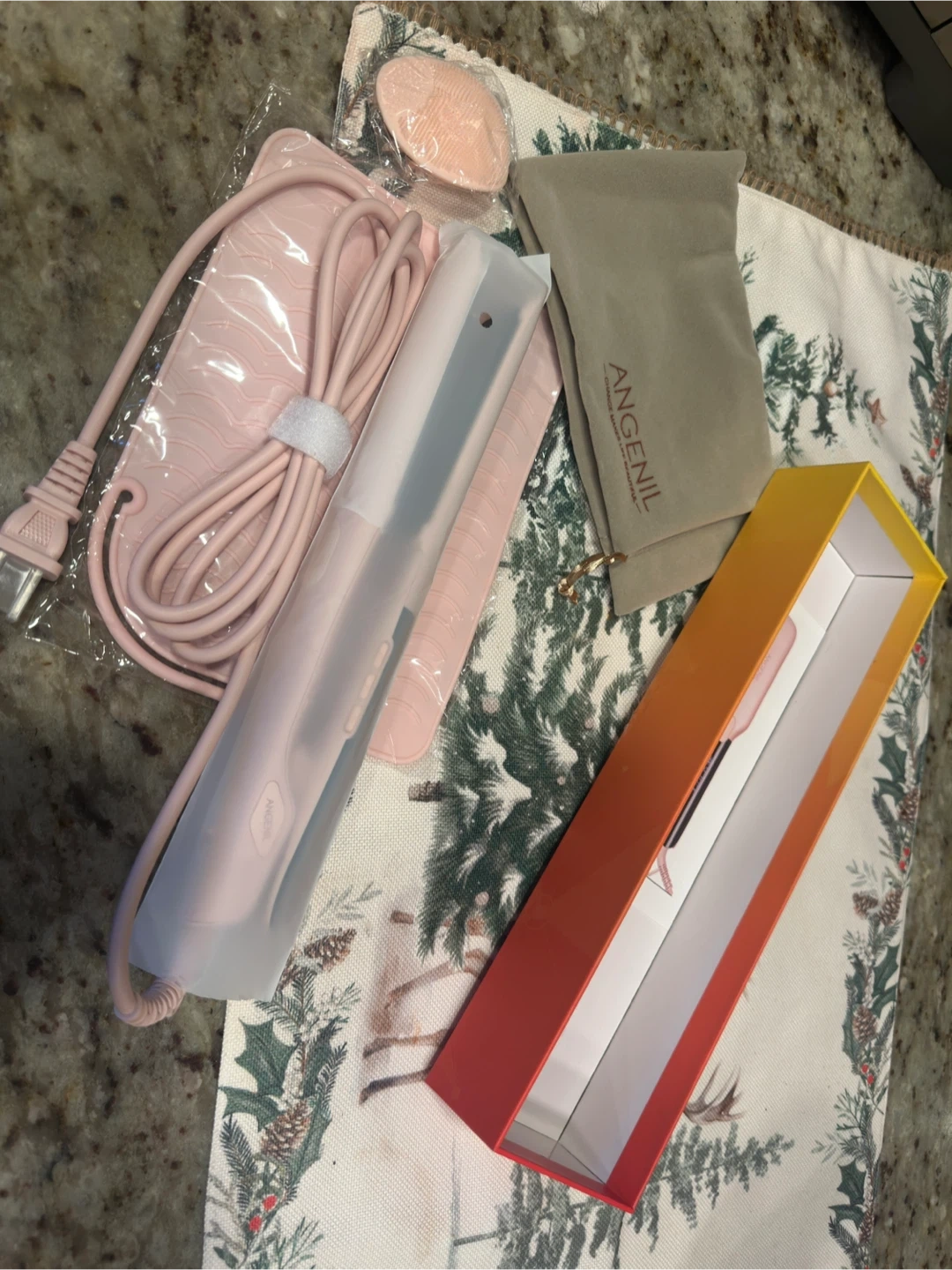 Selling a gently used ANGENIL hair straightener. It comes with all the accessories shown in the picture, including the heat mat, storage pouch, and box. It's in great condition and ready to use!