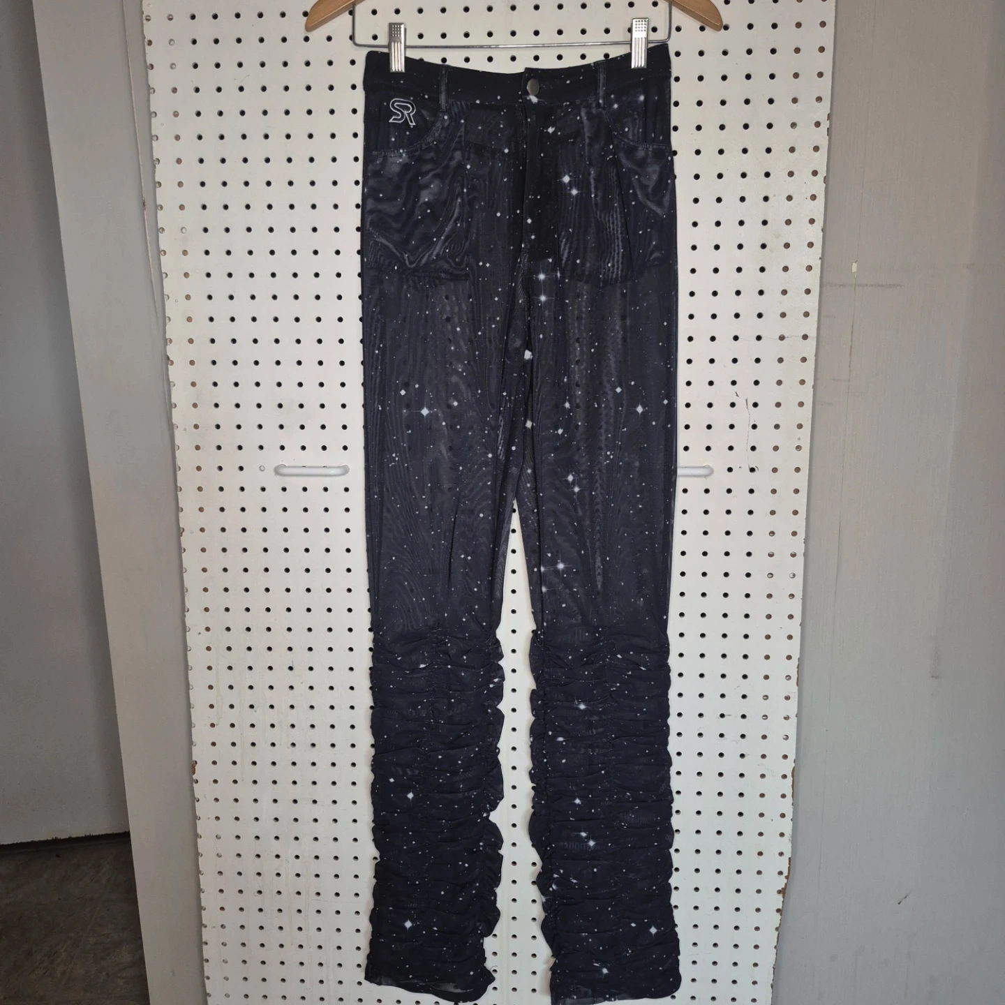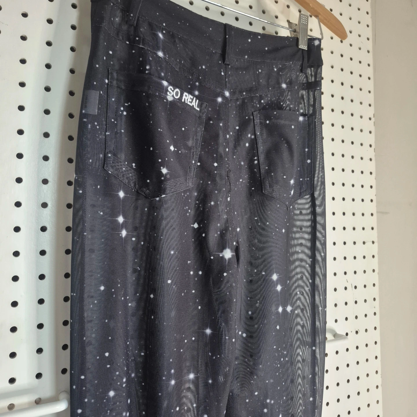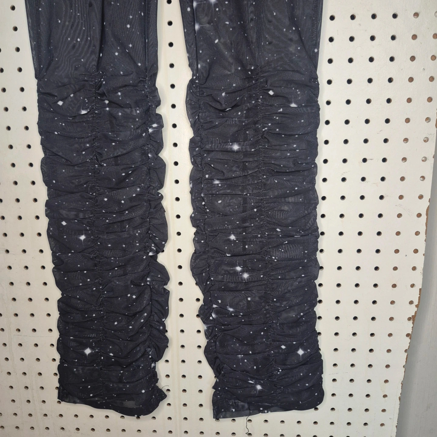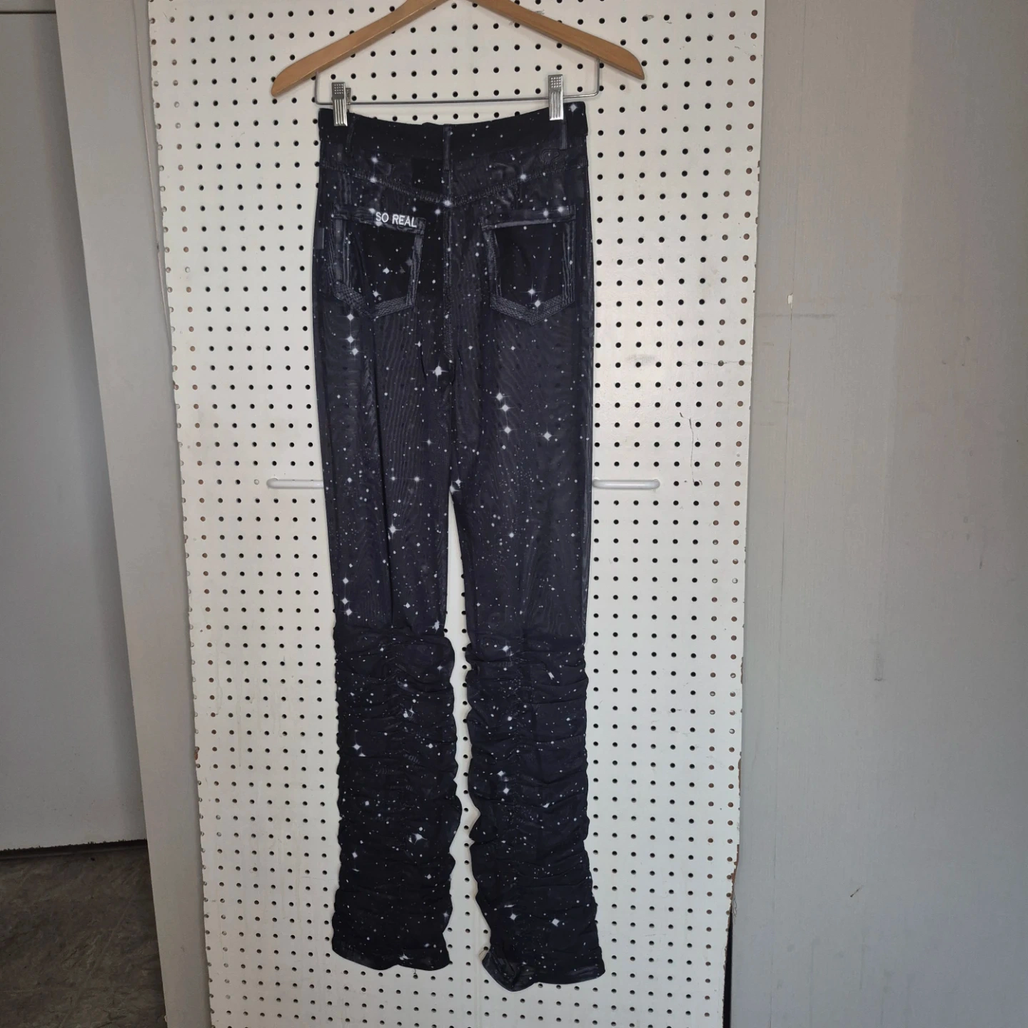 These SO REAL pants feature a unique starry night design and ruched detailing at the bottom! They're perfect for adding a touch of whimsy to your wardrobe. The material is comfortable and stylish, great for everyday wear!
