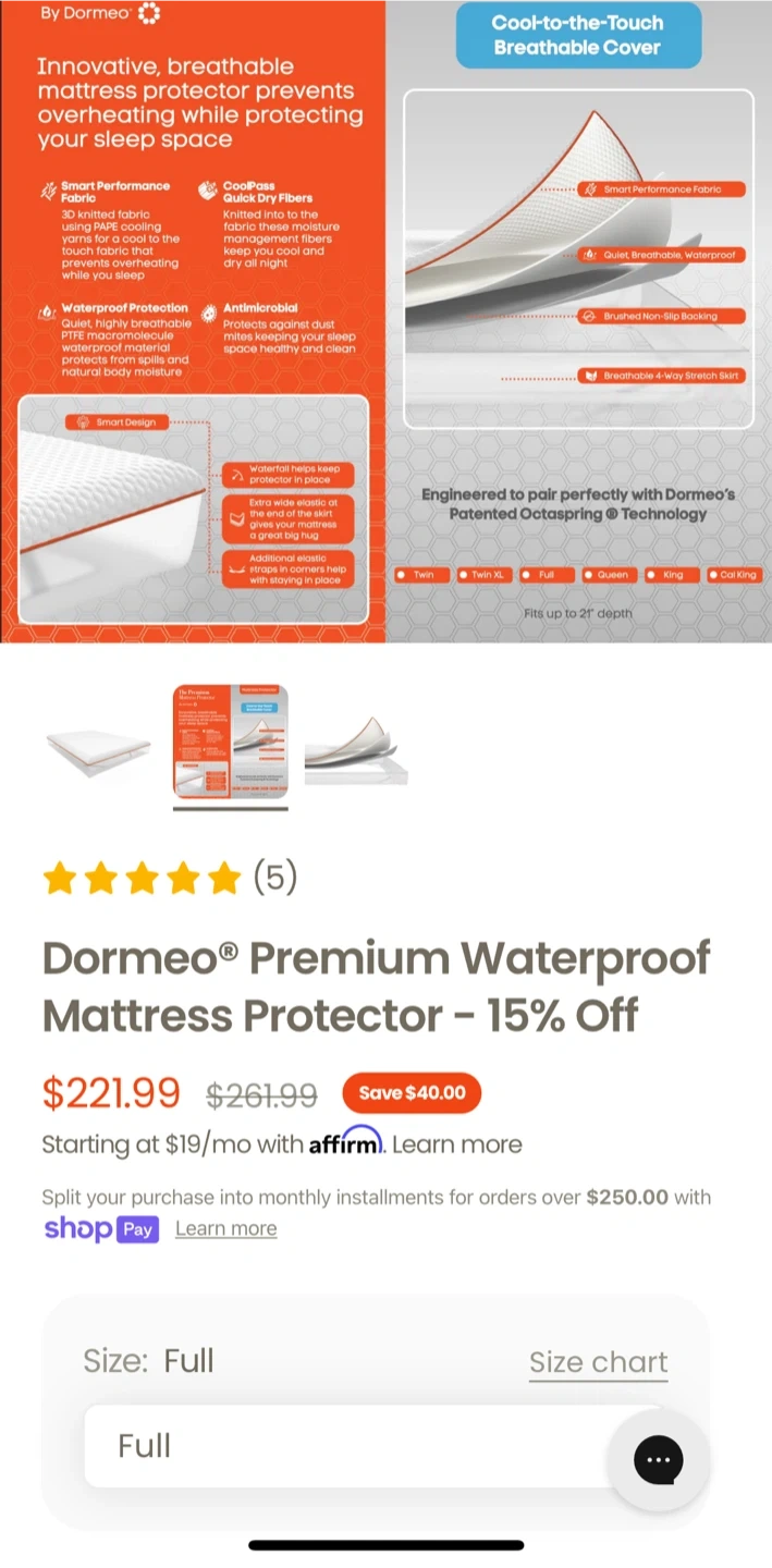 Looking to keep your mattress in tip-top shape? This Dormeo Premium Waterproof Mattress Protector is just what you need! It's a size full and designed with a cool-to-the-touch breathable cover for a comfy sleep. It prevents overheating and offers waterproof protection. Originally listed for $221.99.