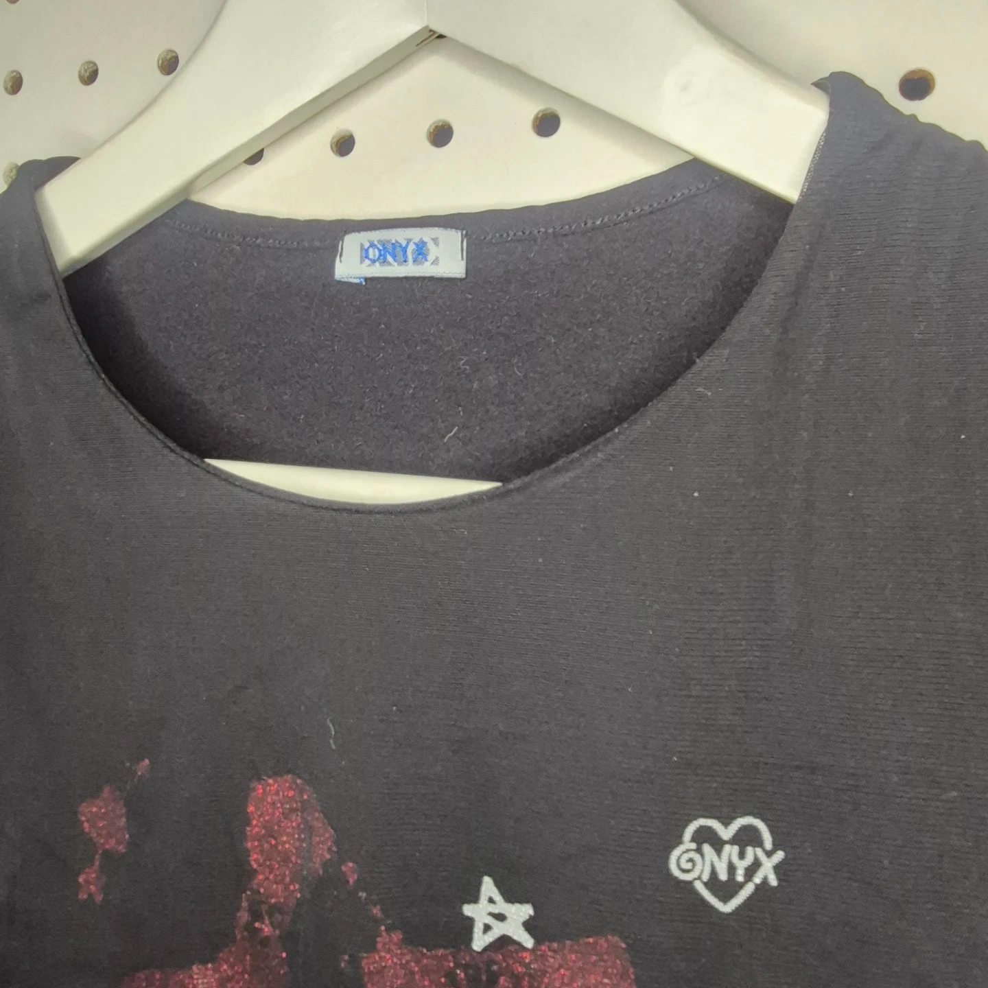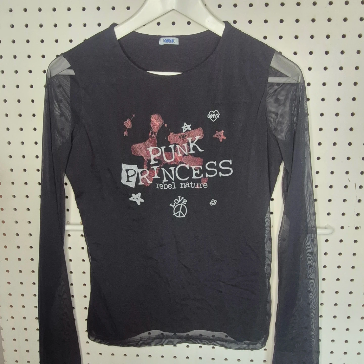 Cute long sleeve top from ONYX featuring a 'Punk Princess' design! It has mesh sleeves and a comfortable fit, perfect for adding a bit of edge to your wardrobe