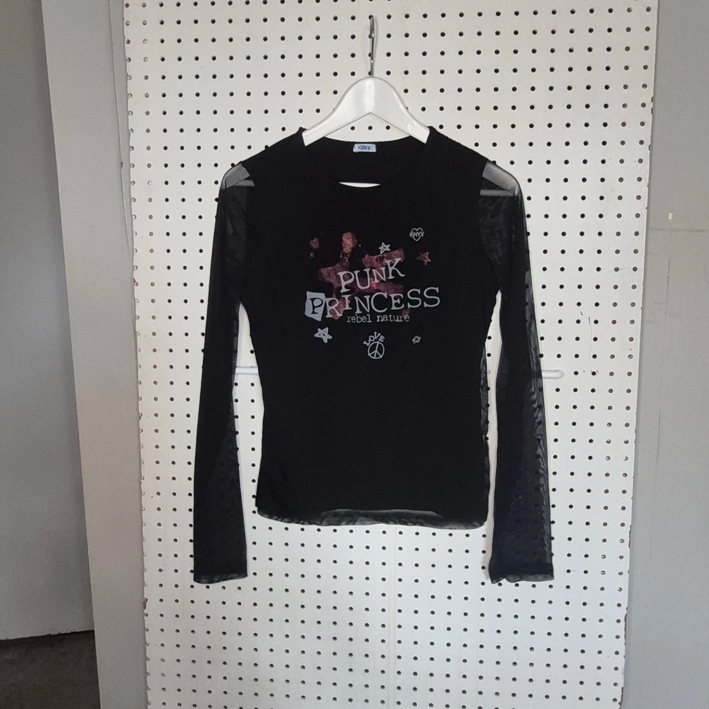 Cute long sleeve top from ONYX featuring a 'Punk Princess' design! It has mesh sleeves and a comfortable fit, perfect for adding a bit of edge to your wardrobe