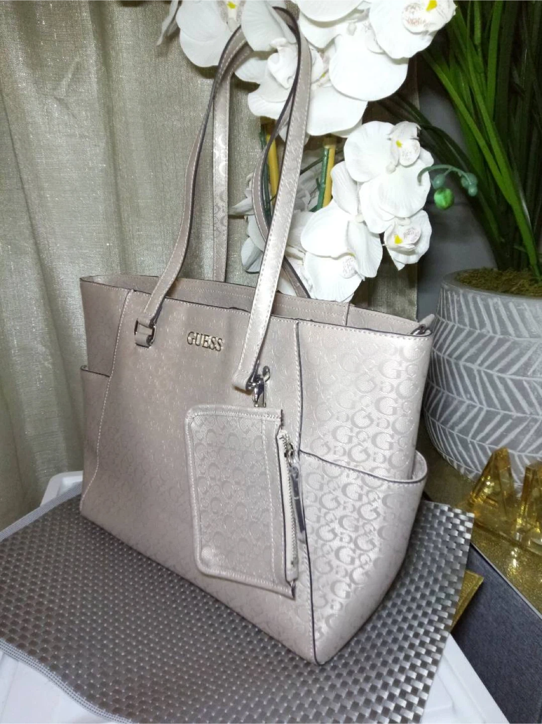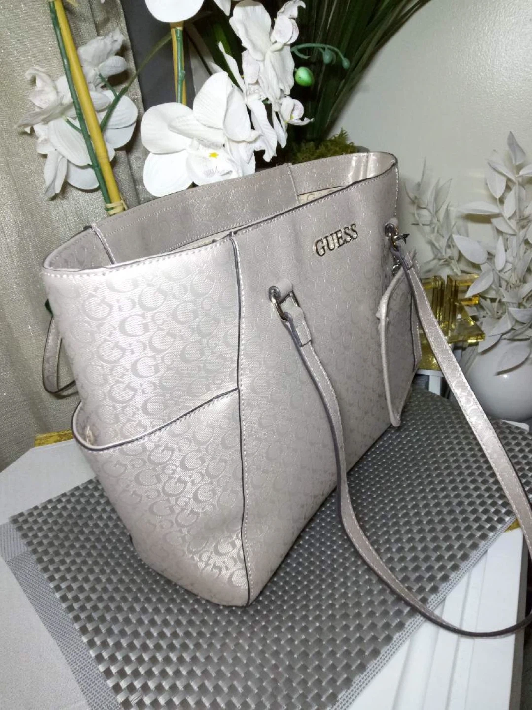 Selling a Guess tote bag in excellent condition! It features the Guess logo pattern throughout the bag. Perfect for everyday use or as a stylish accessory