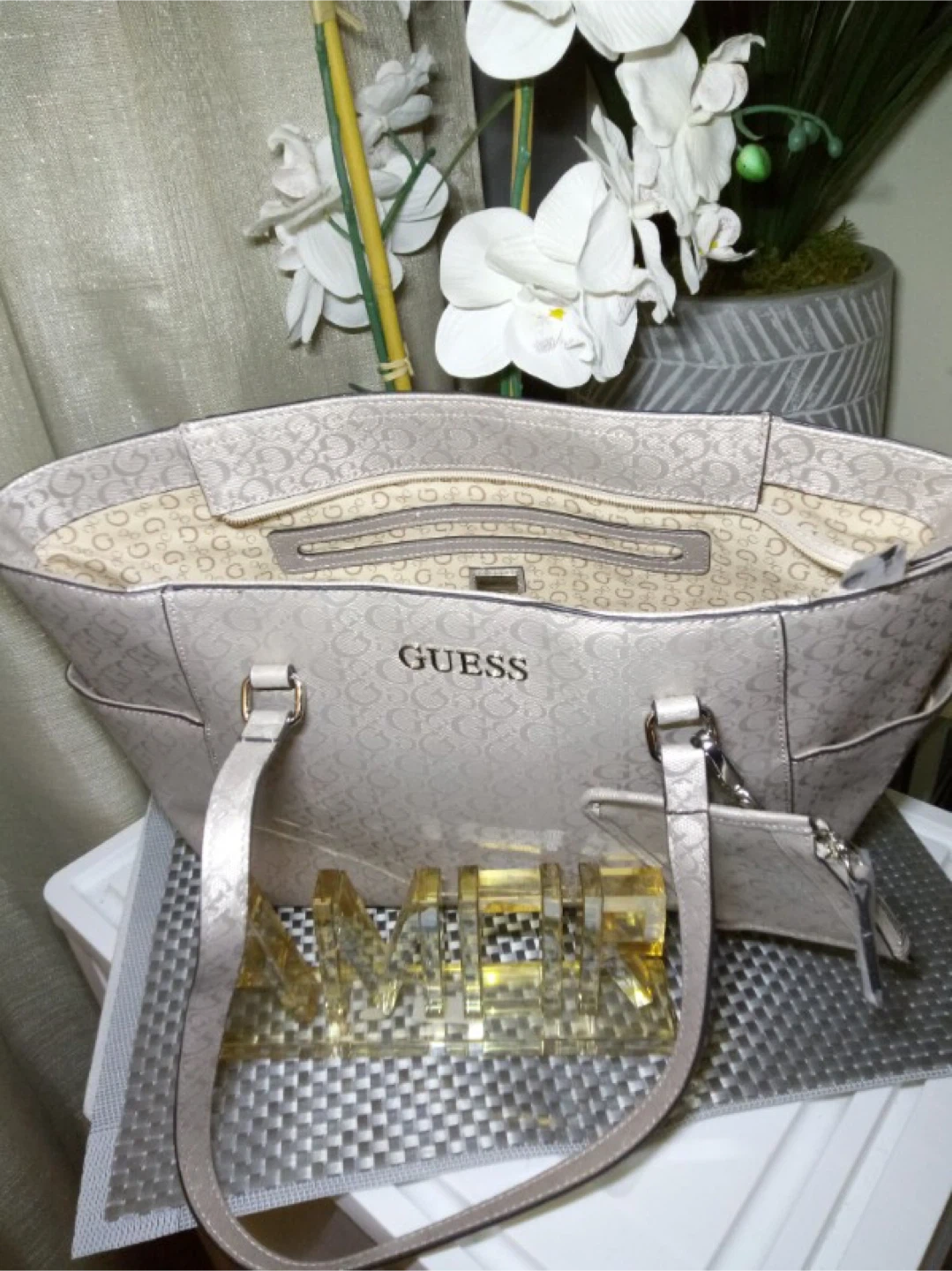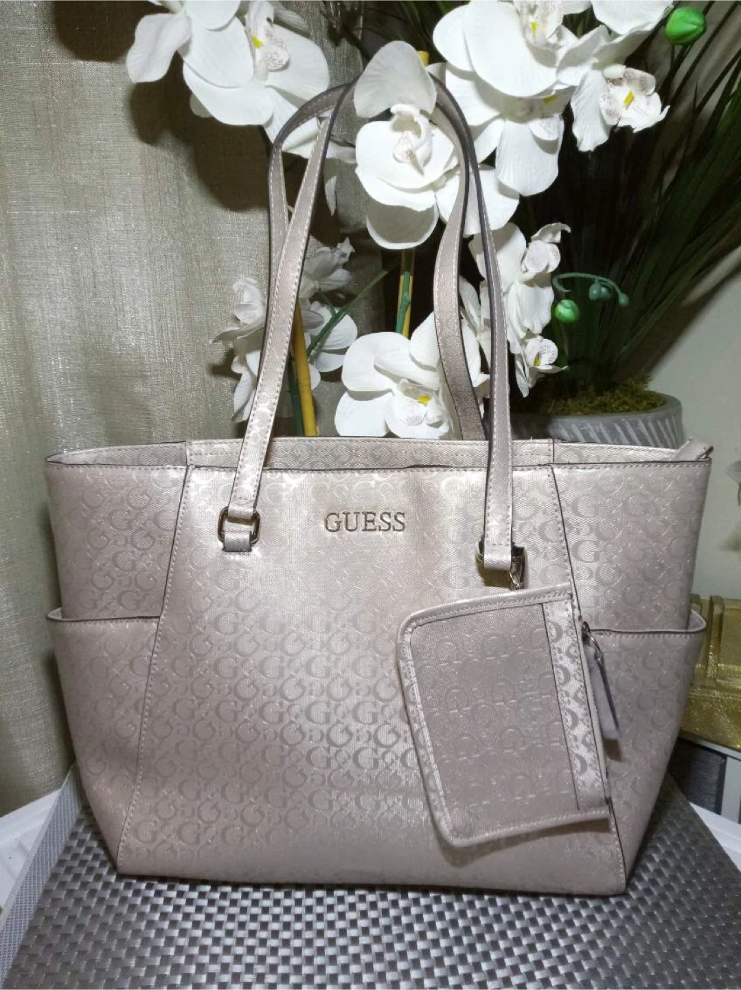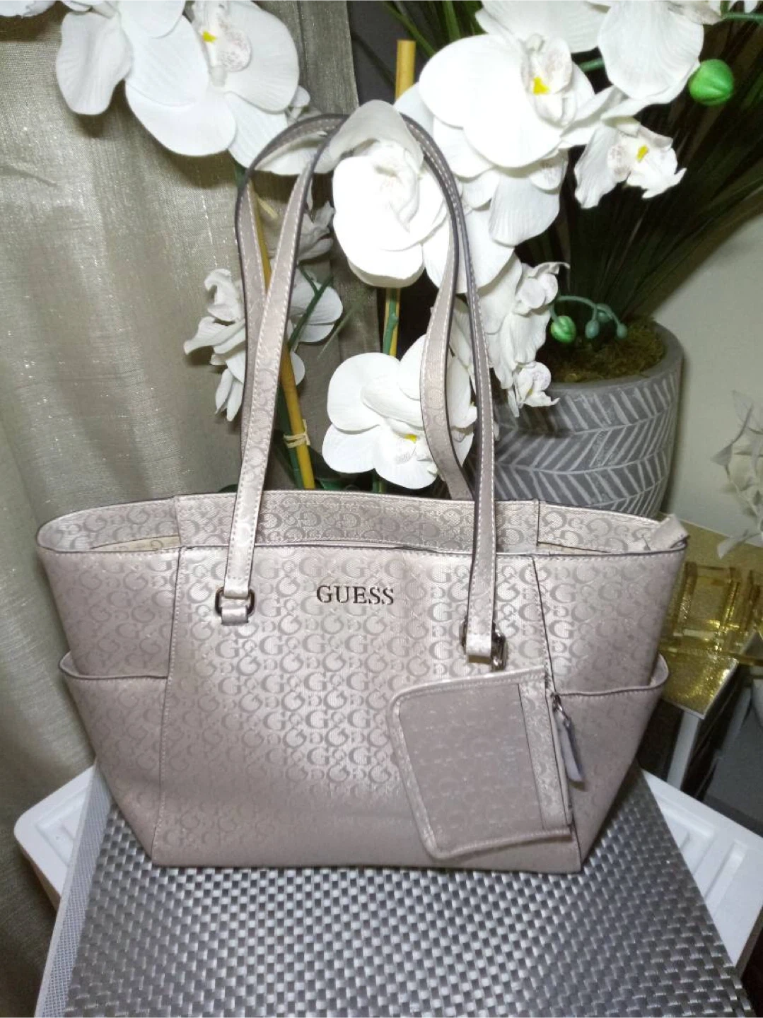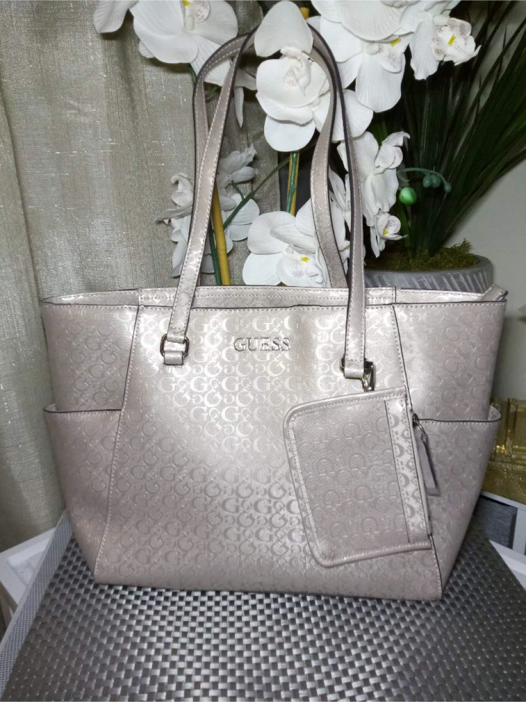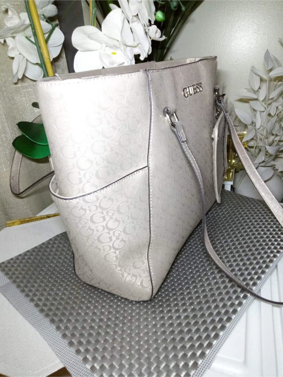 Selling a Guess tote bag in excellent condition! It features the Guess logo pattern throughout the bag. Perfect for everyday use or as a stylish accessory