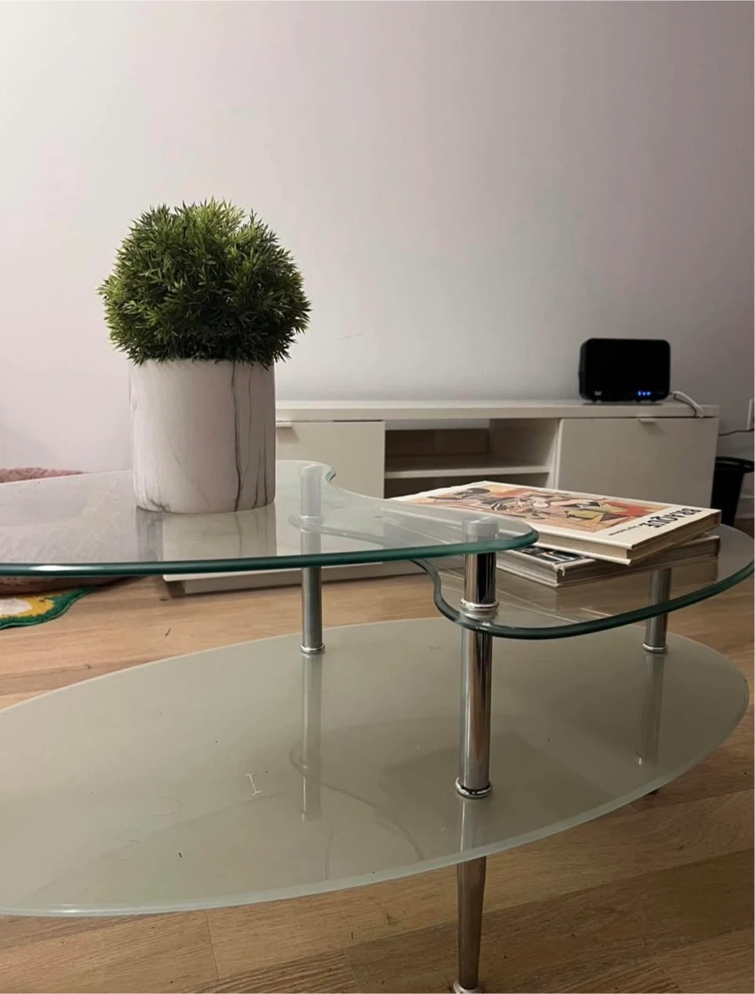 Selling a stylish glass coffee table, perfect for adding a modern touch to your living room! It features a two-tier design, providing ample space for magazines, decor, or your favourite coffee table books. The sleek glass and chrome finish will complement any decor