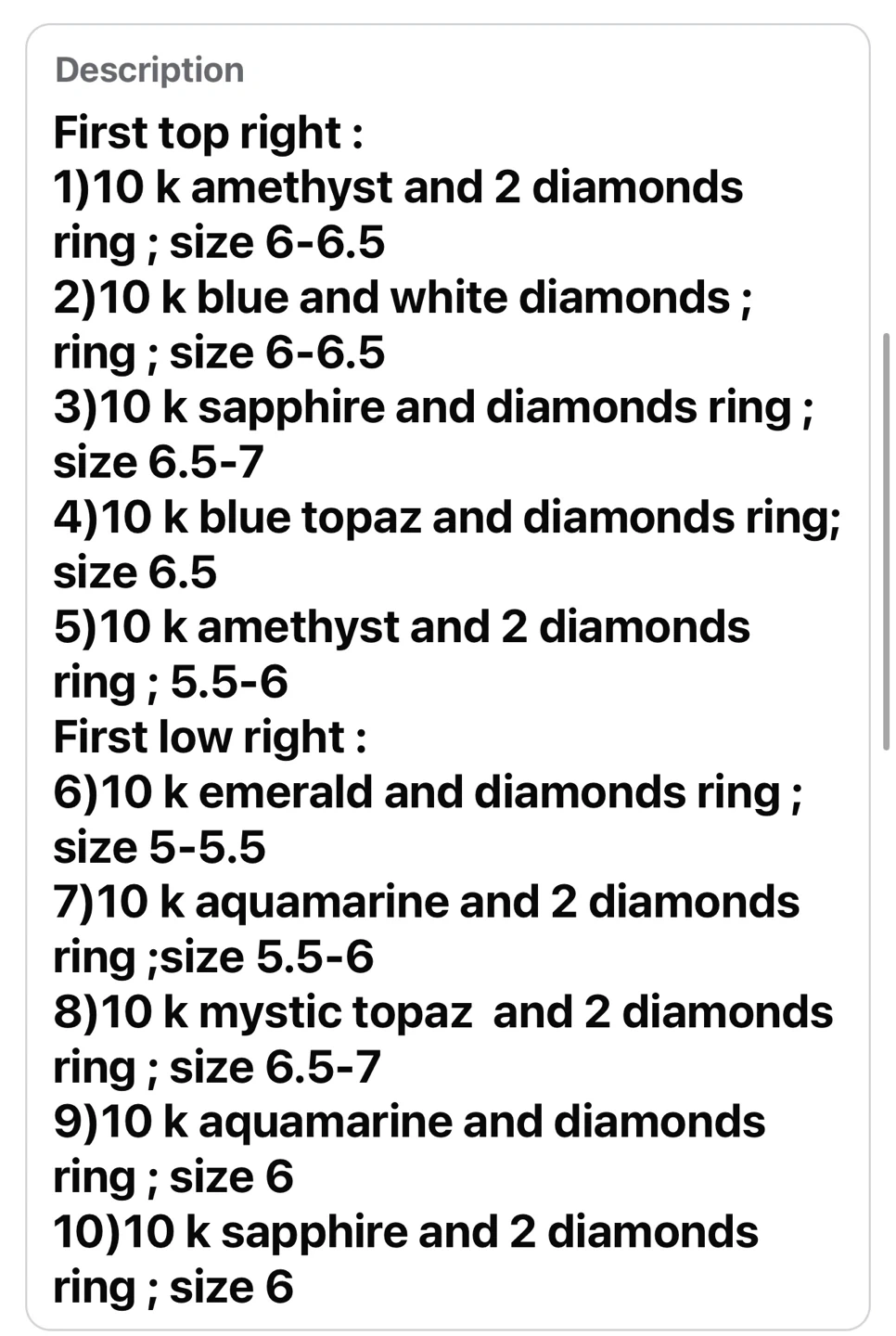 Buy & Sell10 k rings -200 dollars each10 k rings -200 dollars each$20010 k rings -200 dollars each 2-sold 7-soldConditionLike newWHERE TO MEETCheck LocationView MapSELLEROksanaBannerman13110 reviews0 chats·2 favorites·87 viewsSEND CHAT TO SELLERHi Oksana! I’m interested in your listing.Hi Oksana! I’m interested in your listing.Get the Karrot app to chatSign In to chat