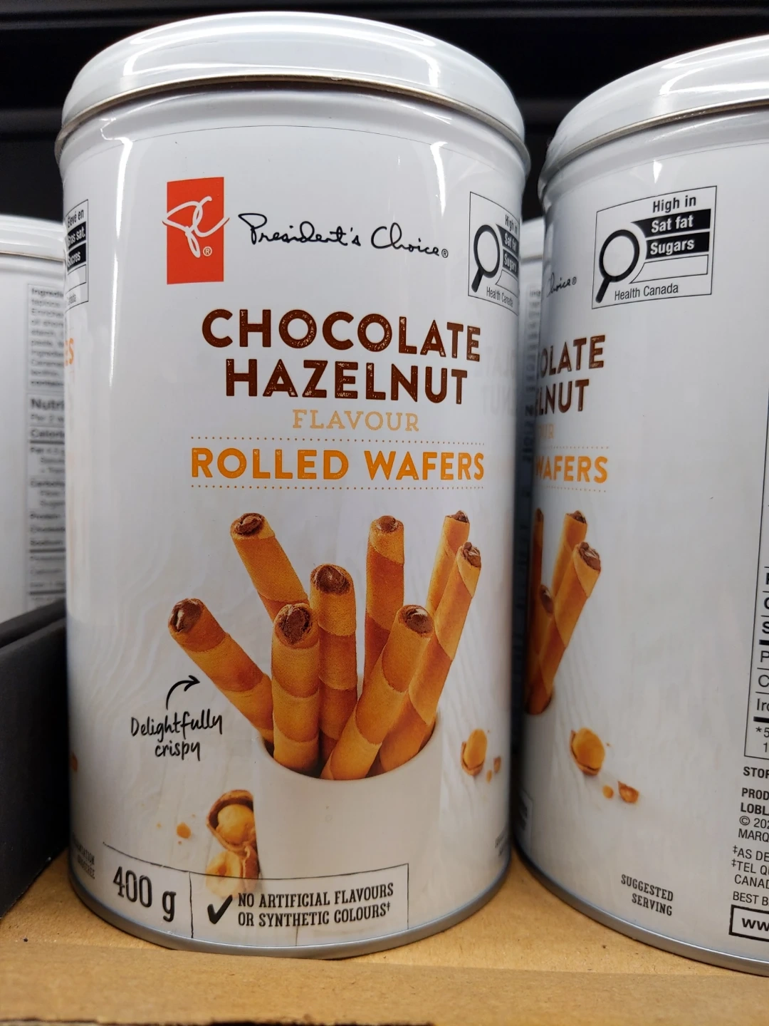 Enjoy these President's Choice Chocolate Hazelnut Flavour Rolled Wafers! They are delightfully crispy and come in a 400g tin
