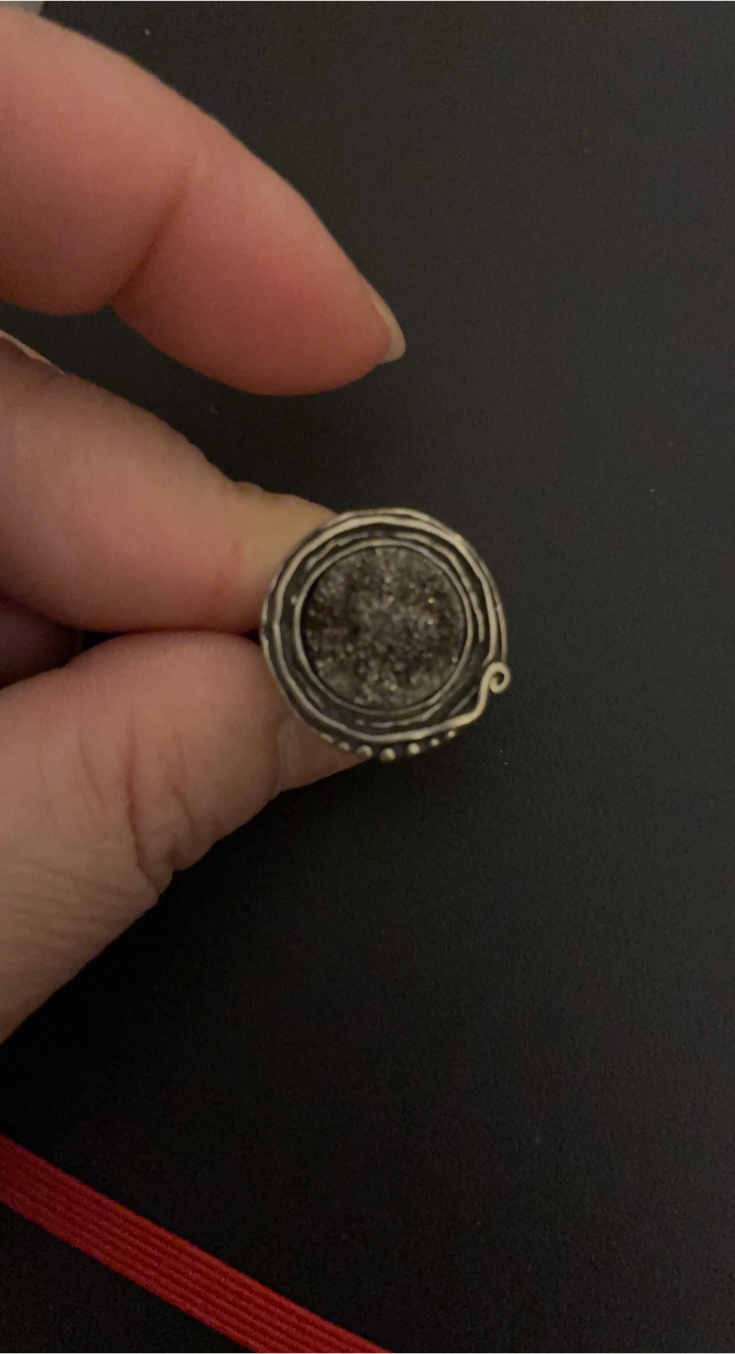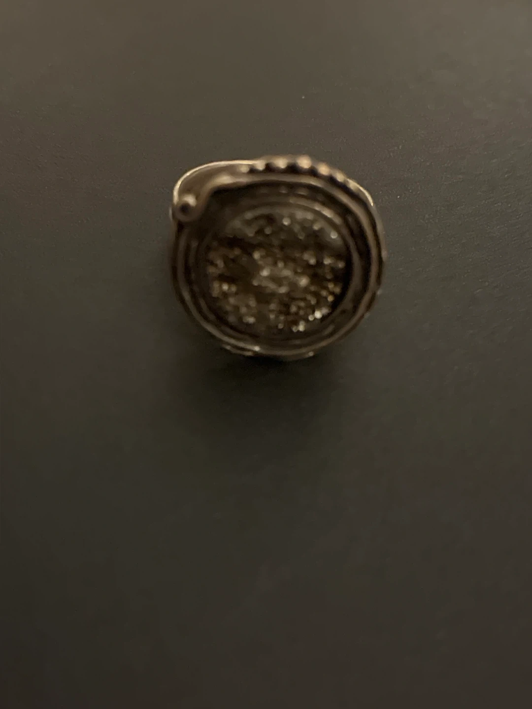 Selling a unique vintage rhinestone druzy ring with a silver band! The druzy stone has a beautiful sparkle and the silver band is intricately designed. It's in great condition and ready to add a touch of elegance to your jewelry collection