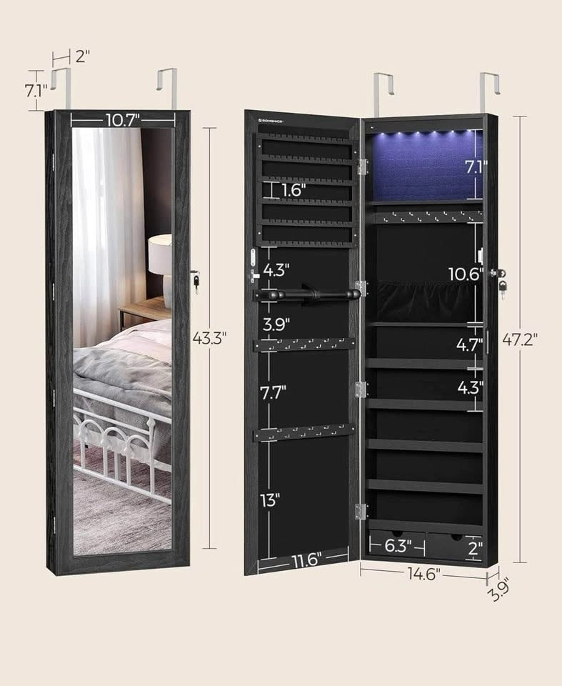 Elegant, secure, and incredibly functional β this SONGMICS LED mirror jewelry cabinet is the perfect all-in-one solution for organizing jewelry while saving space. A full-length mirror with built-in LED lights, lockable door, and smart interior layout make it ideal for everyday use.