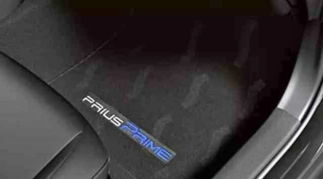Durable, fade-resistant carpet features a Prius Prime logo with a repetitive Hybrid Synergy Drive (HSD) pattern throughout the carpet.