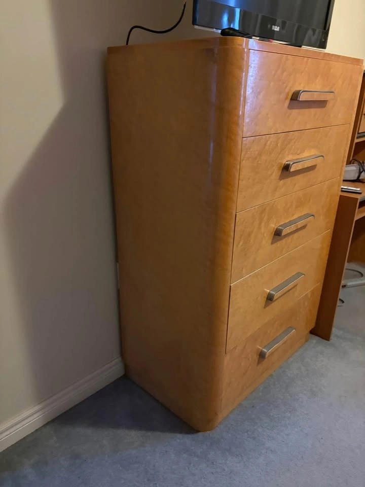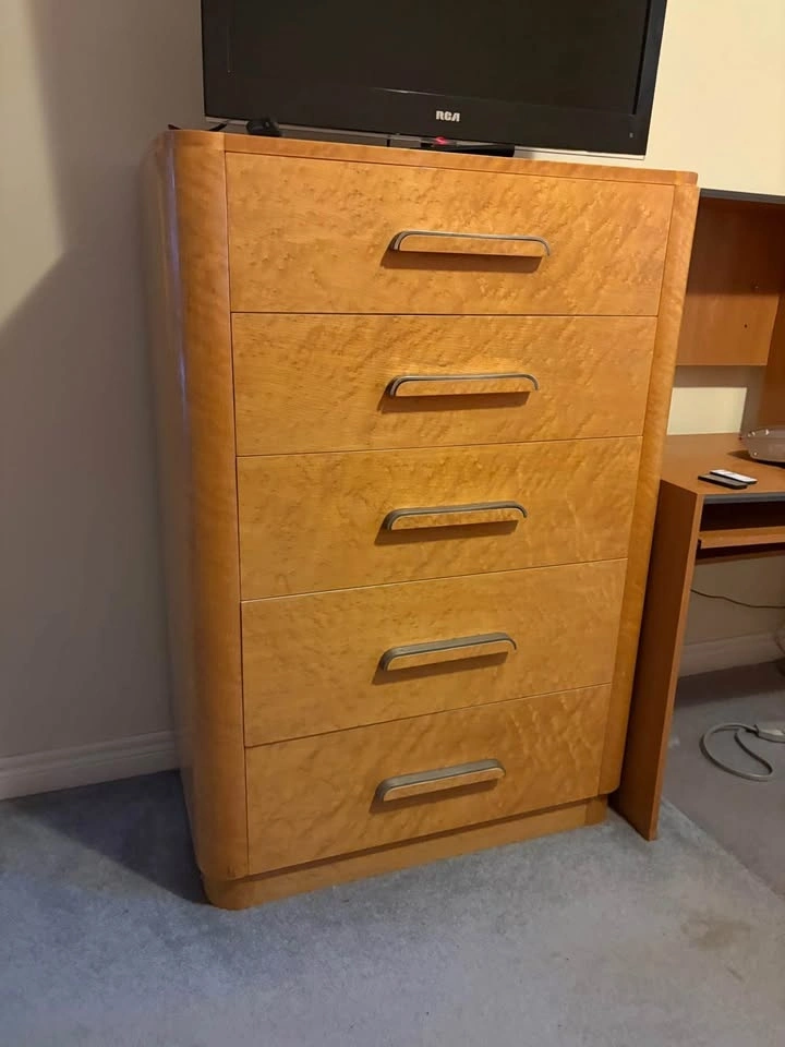 • Widdicomb 5-Drawer Tallboy Dresser: Excellent storage with beautiful grain matching. Measures 48” high 34” wide 19”deep