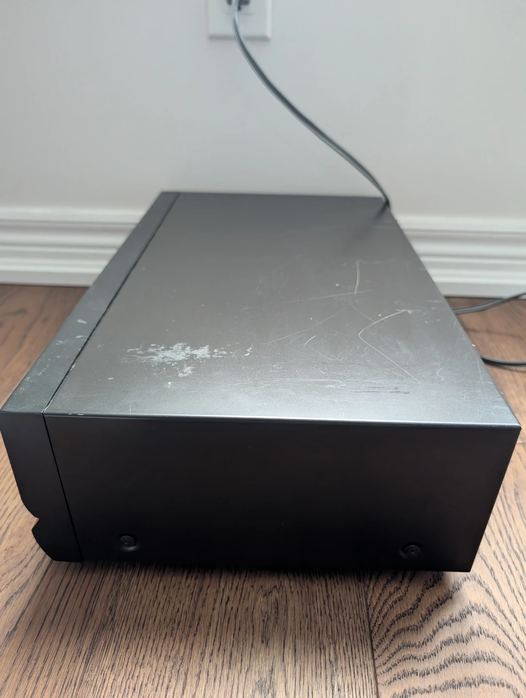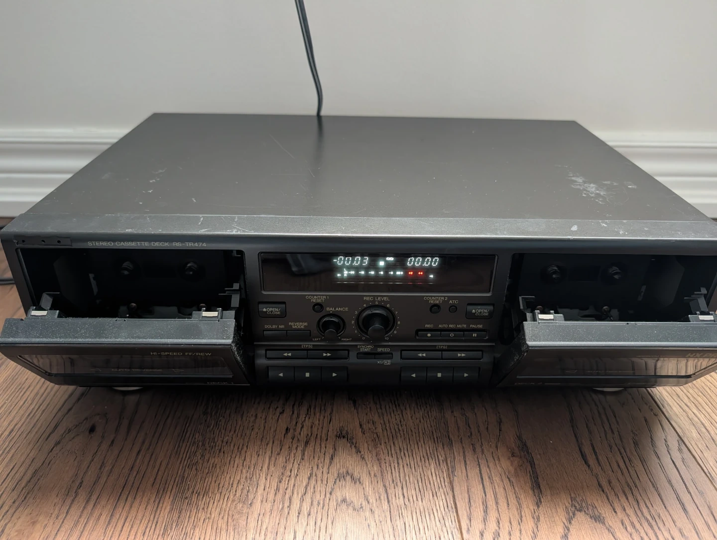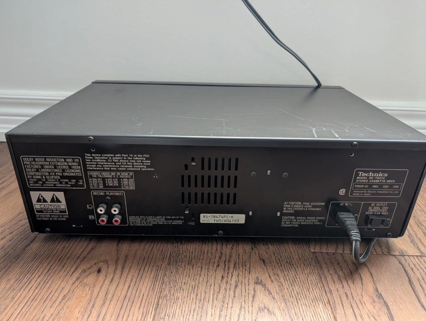 Technics RS-TR474 stereo cassette deck. It has some wear and tear, as you can see in the photos, but it's still functional. It's a double cassette deck with auto reverse.